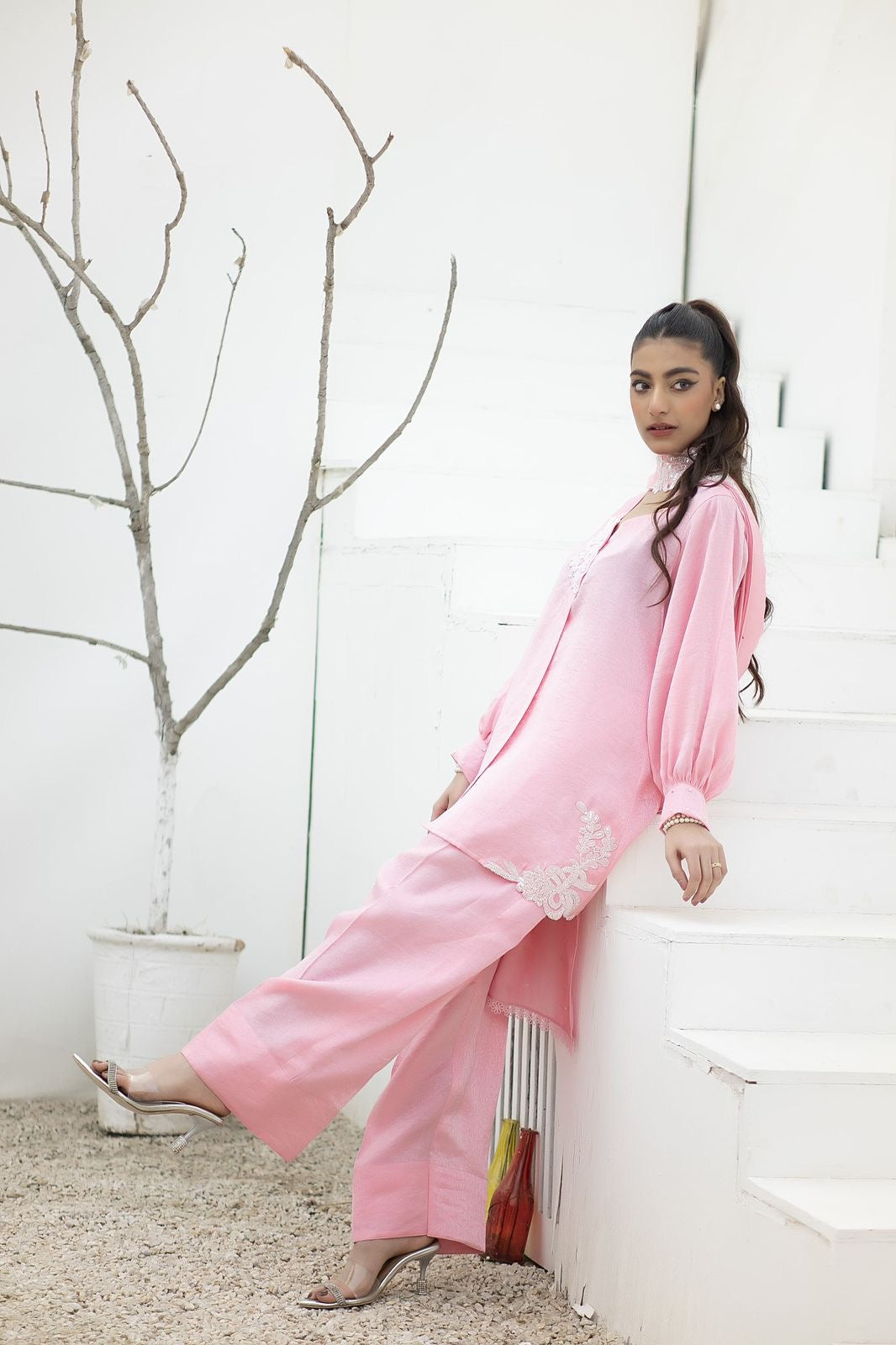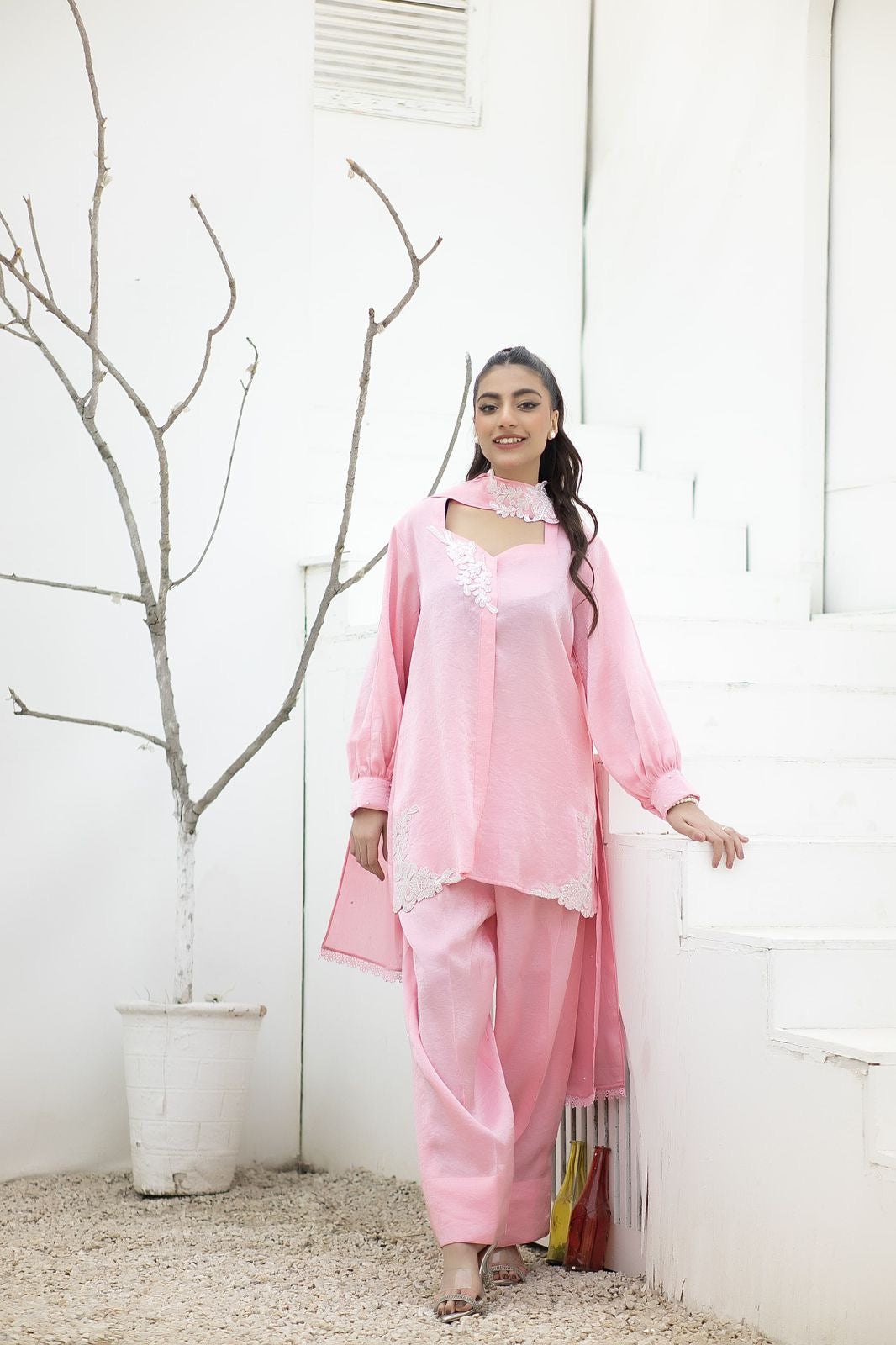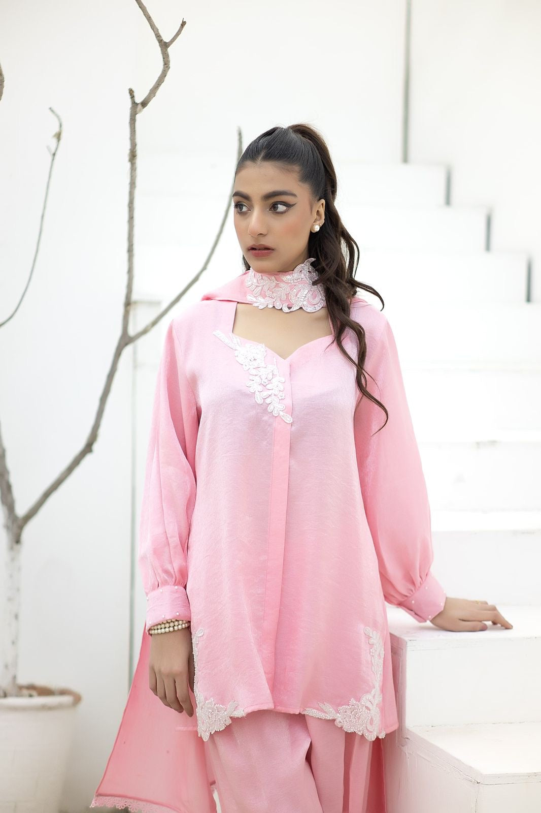 This beautiful pink outfit is cut out of lava silk, easy breezy fabric with minimal details on the sweetheart neck and hem. Paired with farshi pants and a sash dupatta