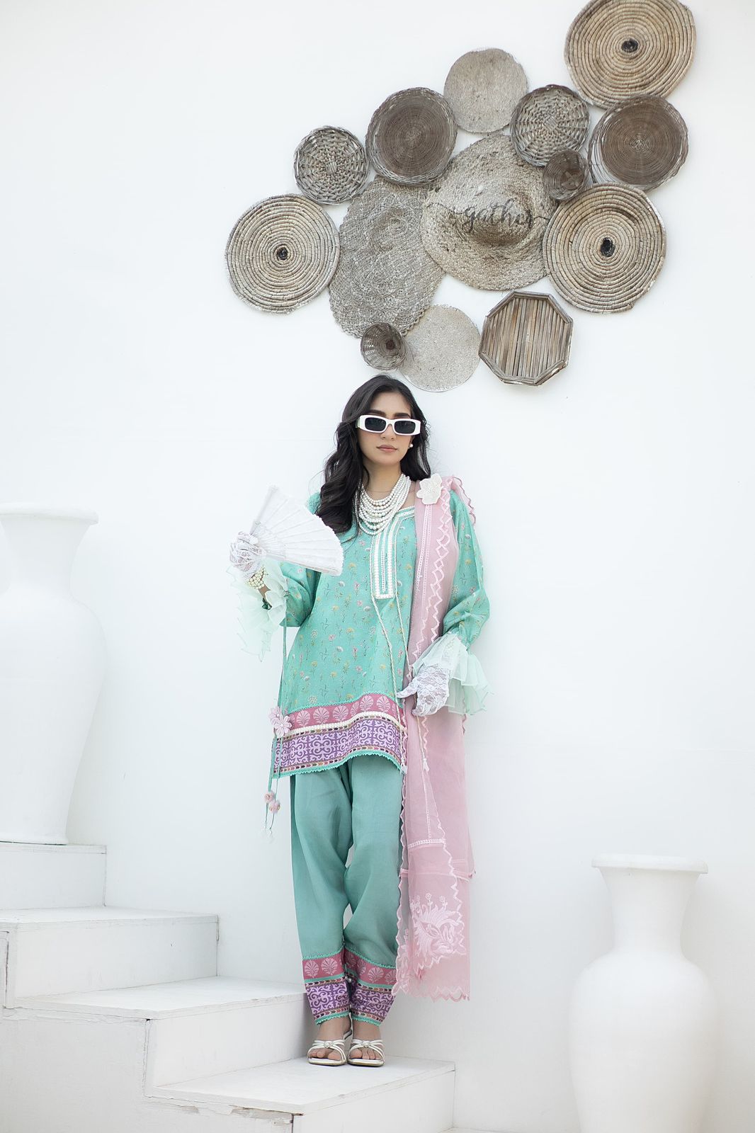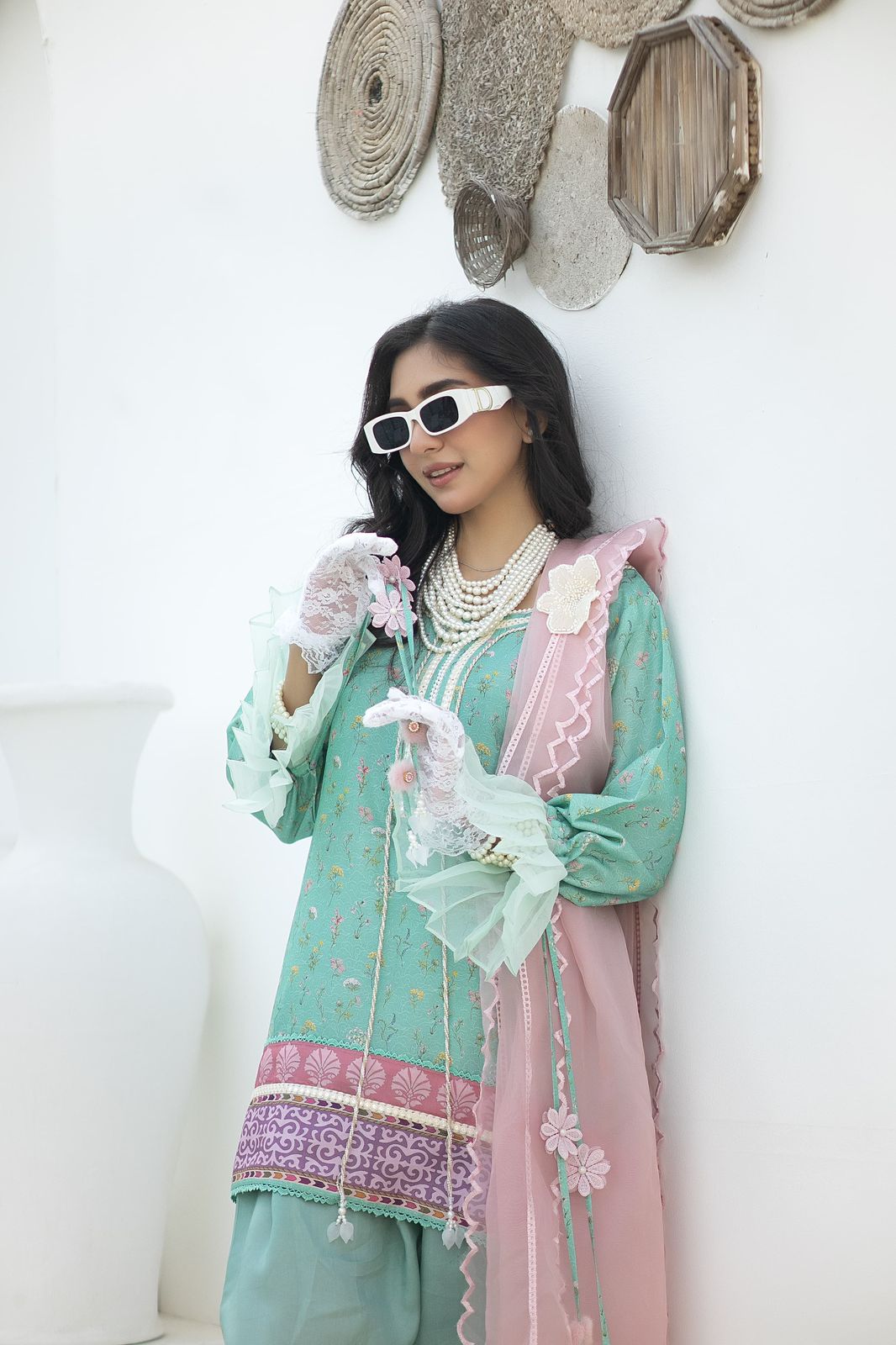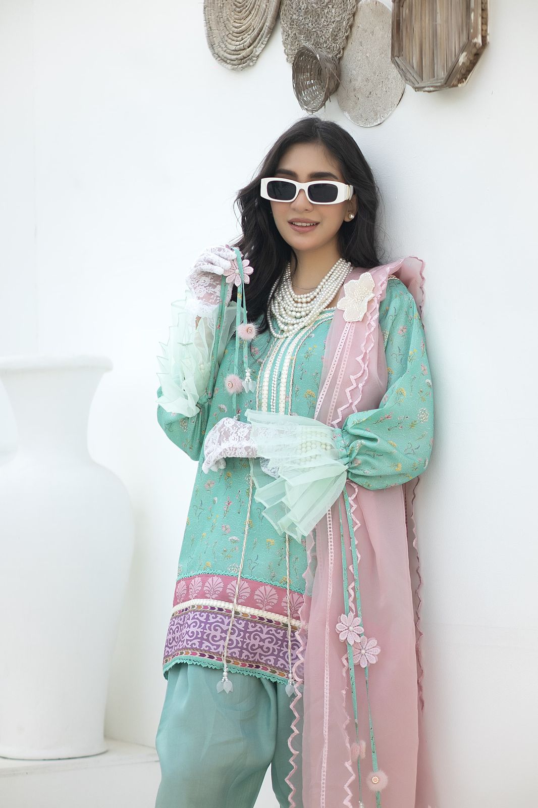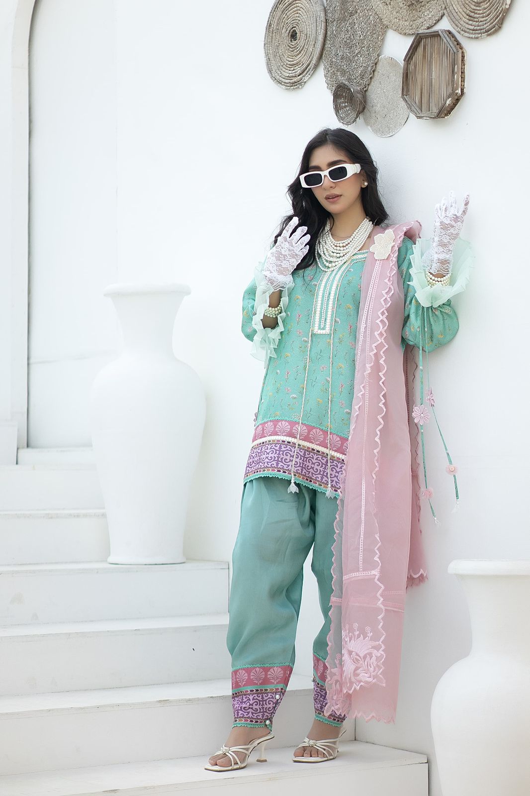 A vibrant turquoise hue korean raw silk short shirt with botanical flowers digital print. Paired with a shalwar and combination organza dupatta.