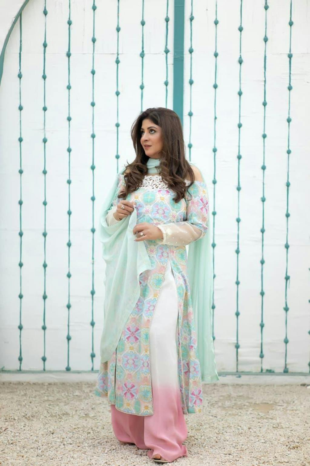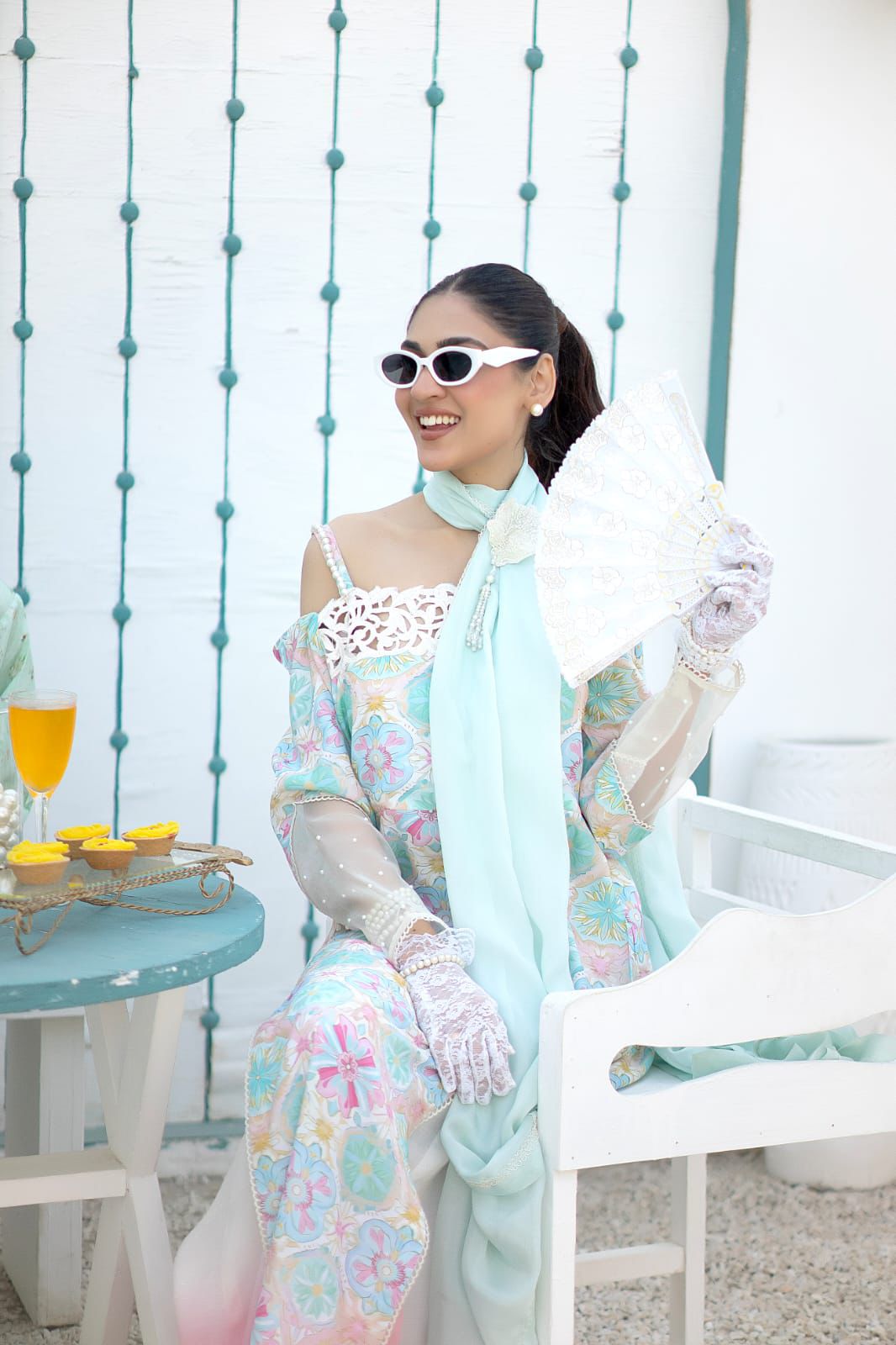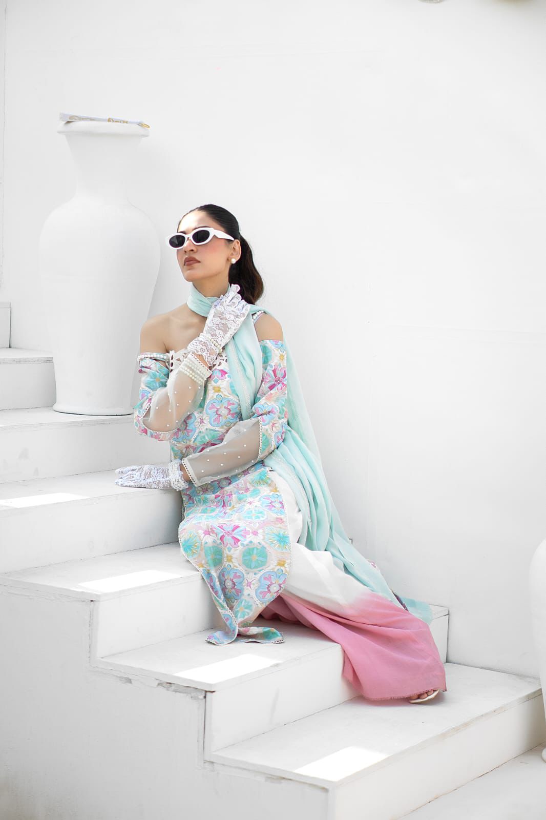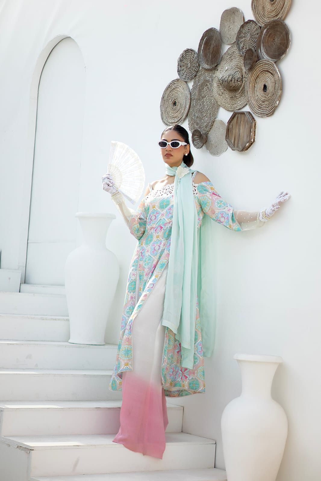 A beautifully crafted light aqua ensemble, this elegant long shirt has a refreshing digital print and a touch of modern silhouette with off shoulder look, pearl straps and lace work on neck. Work with ombre flared pants. Beautifully crafted sleeves with organza and pearl details, comes with a silk dupatta
