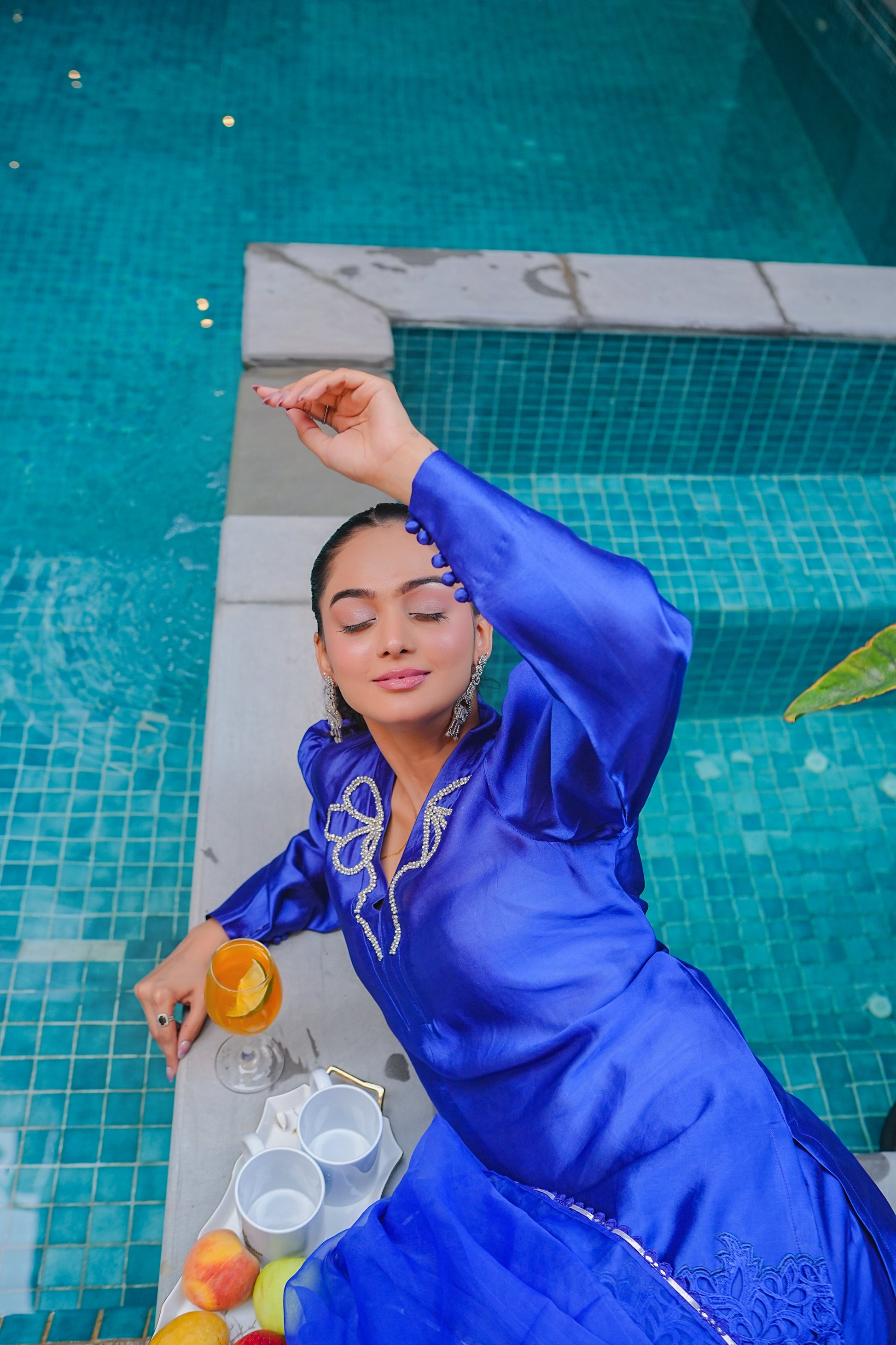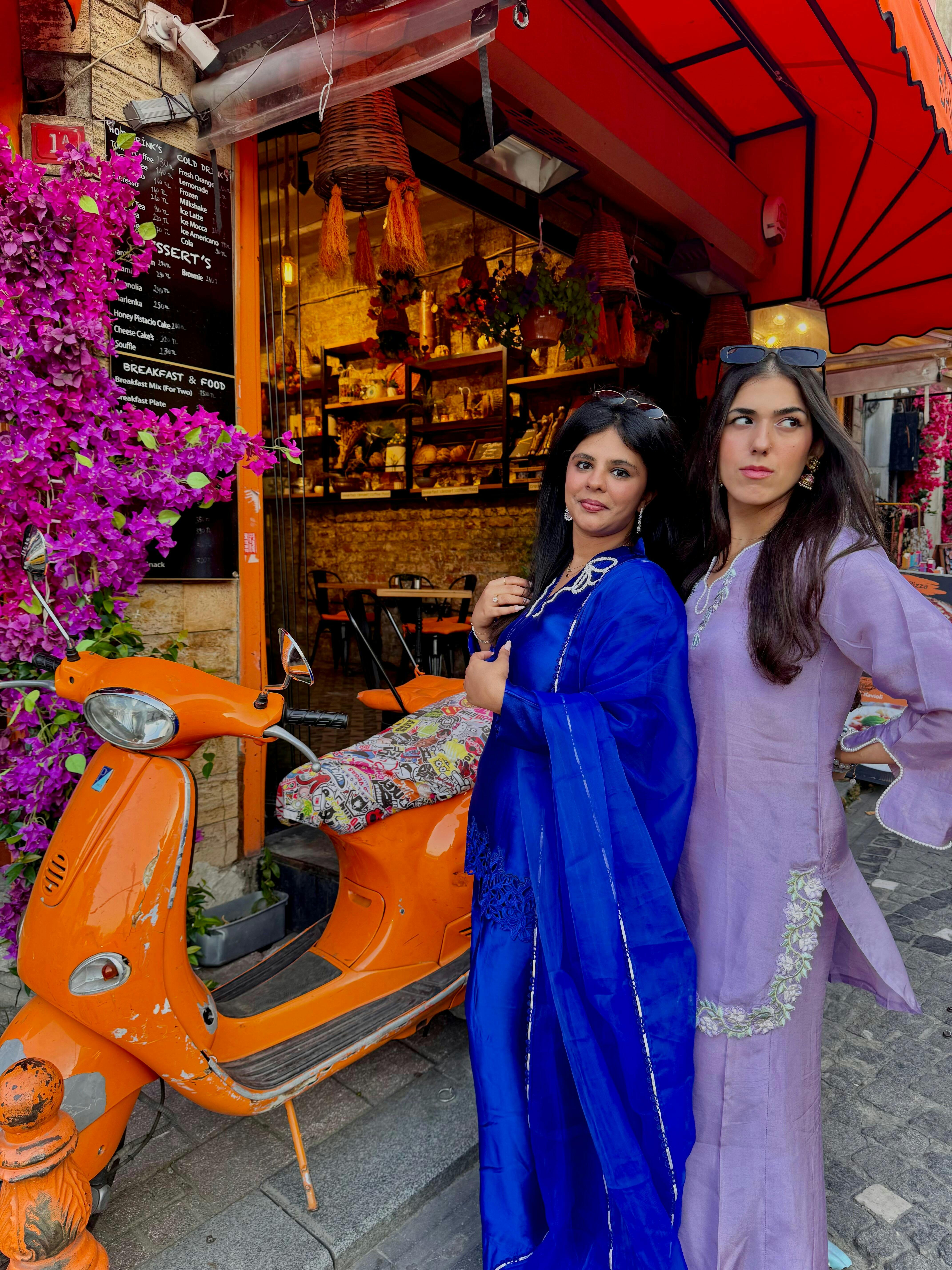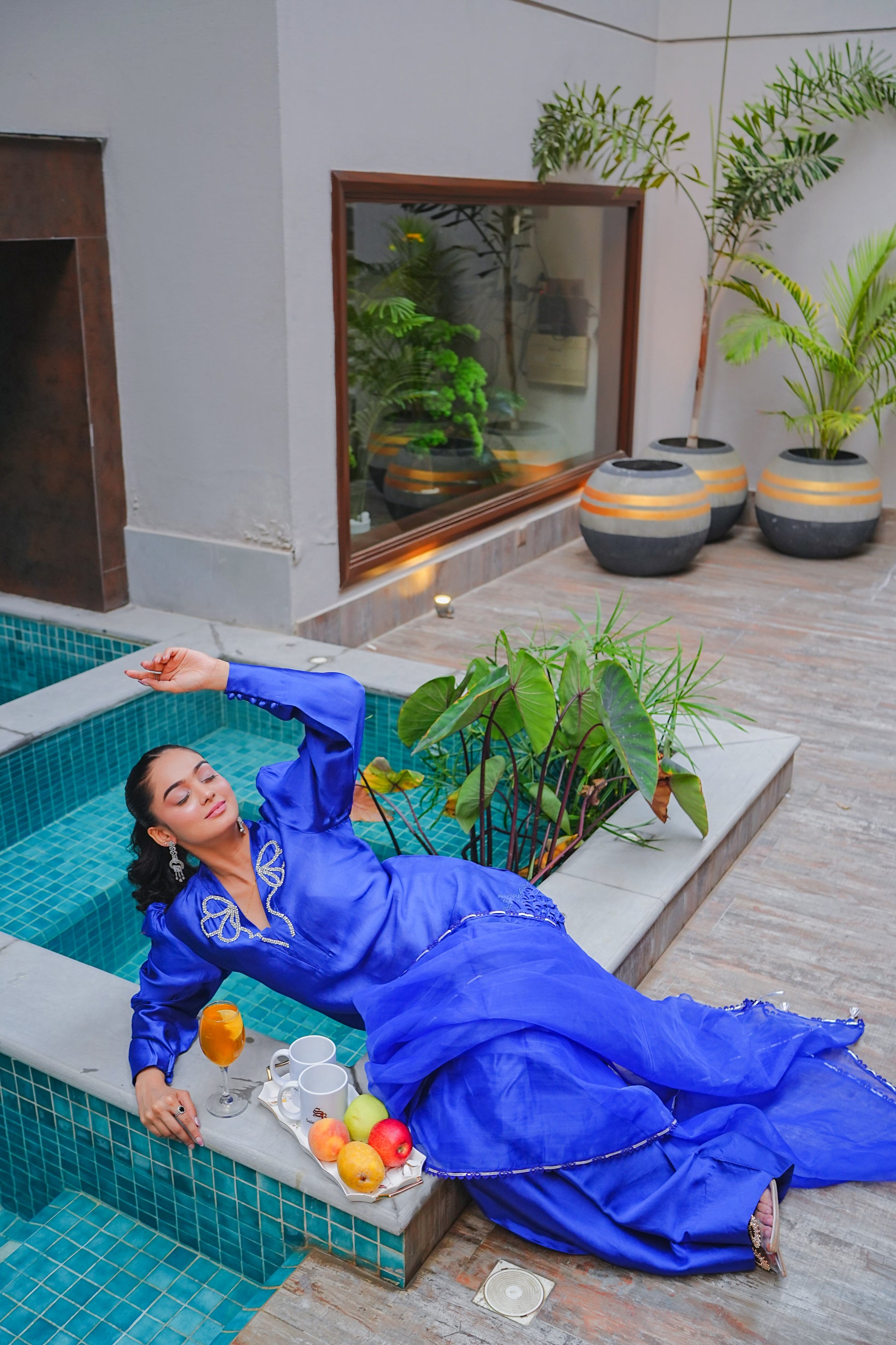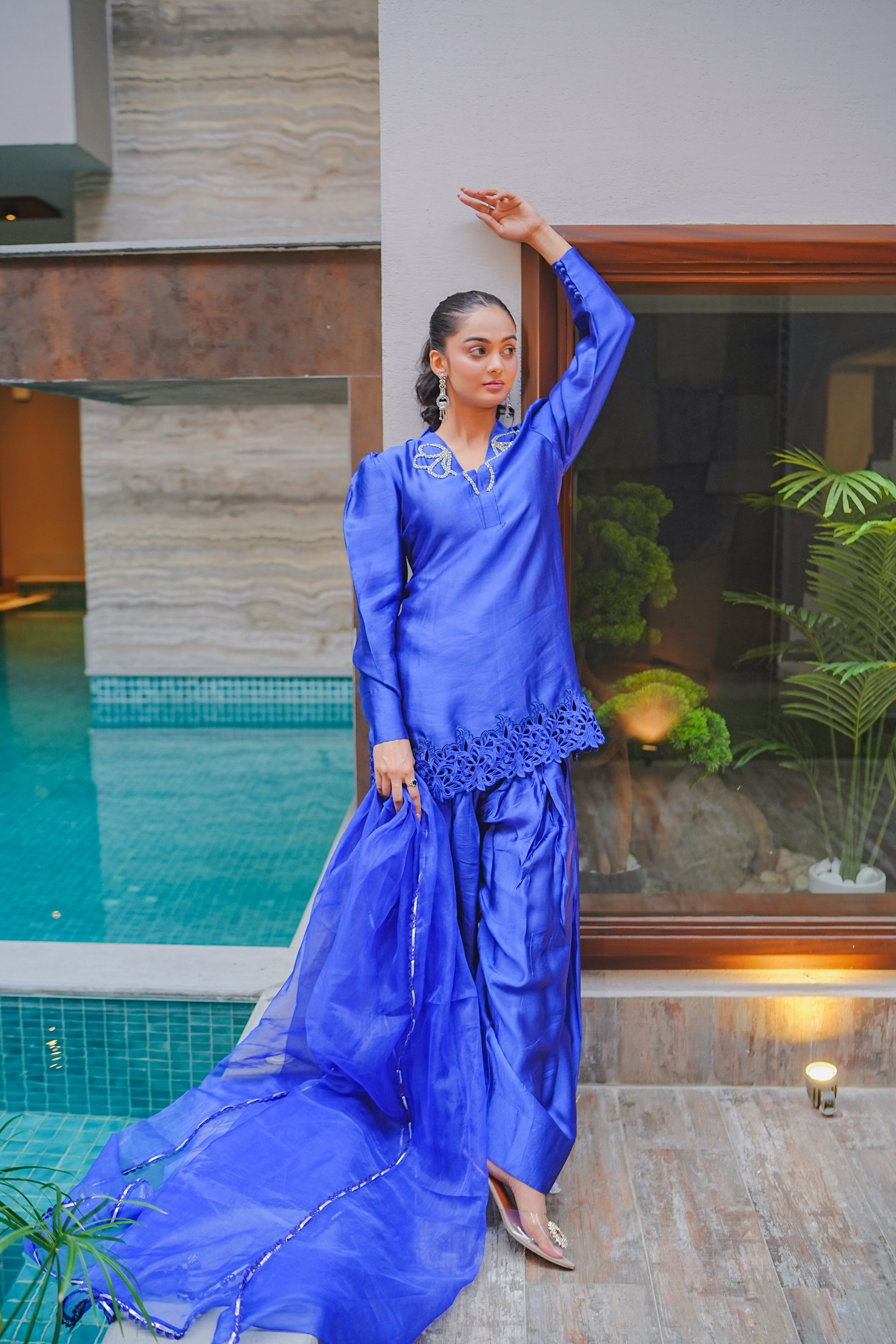 A striking cobalt blue raw silk ensemble featuring delicate handwork, loop button details, lace work and a graceful silhouette. A perfect blend of modern sophistication and timeless Eastern elegance. Paired with farshi shalwar and an organza dupatta with dhanak details.