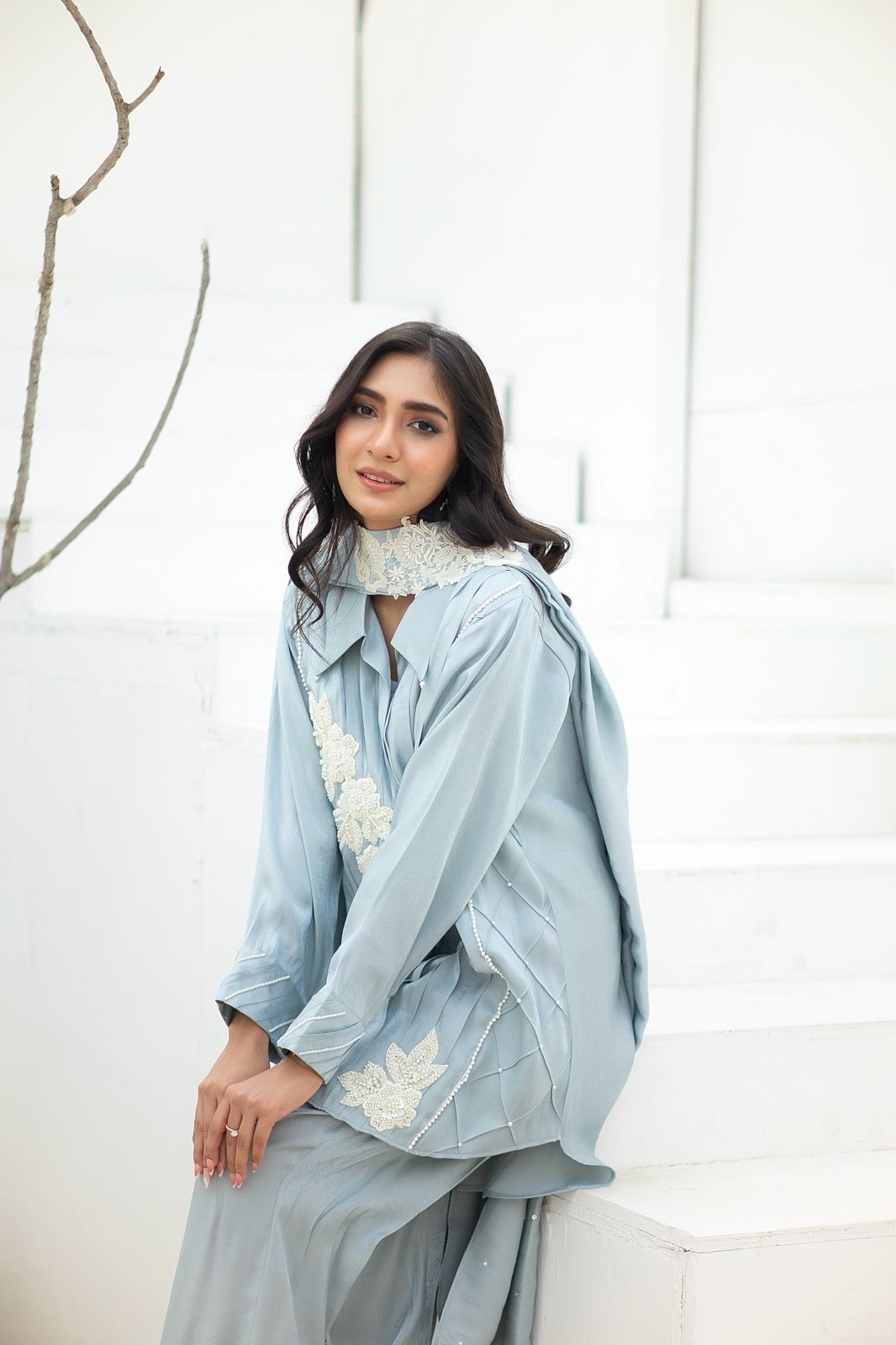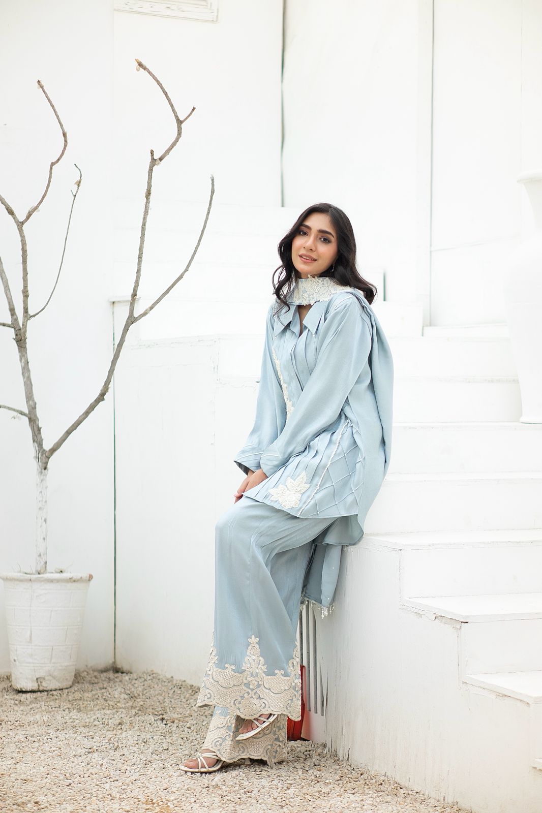 Perfect for your soirées, this outfit is cut from lava silk. The blouse has fabric manipulation details and bunches appliqued at the front. Worn with pleated pants detailed with lace applique.