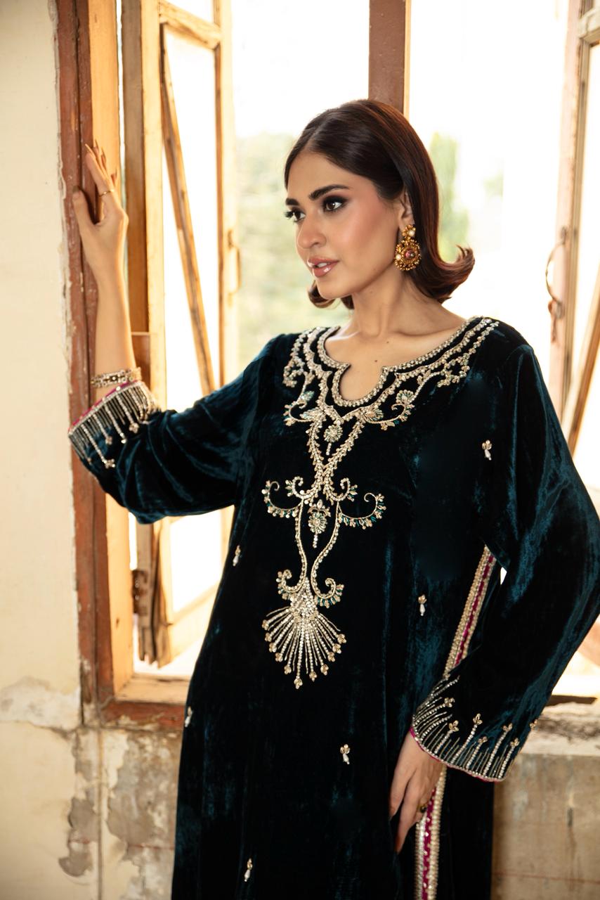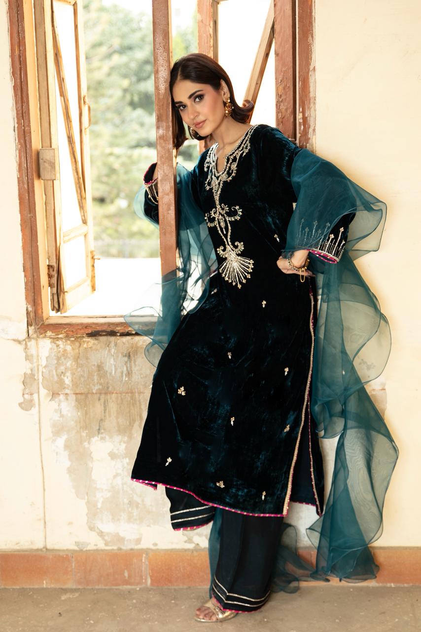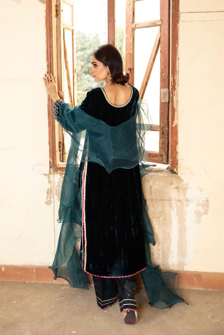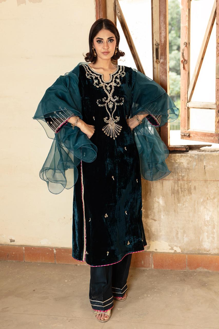 This outfit features a deep midnight-blue velvet kameez, rich in texture and luxurious in its fall. The velvet is adorned with delicate gold embellishments scattered across the front, while the neckline is highlighted with intricate handwork that adds a regal, statement feel. Worn with flared pants and ruffled organza dupatta.