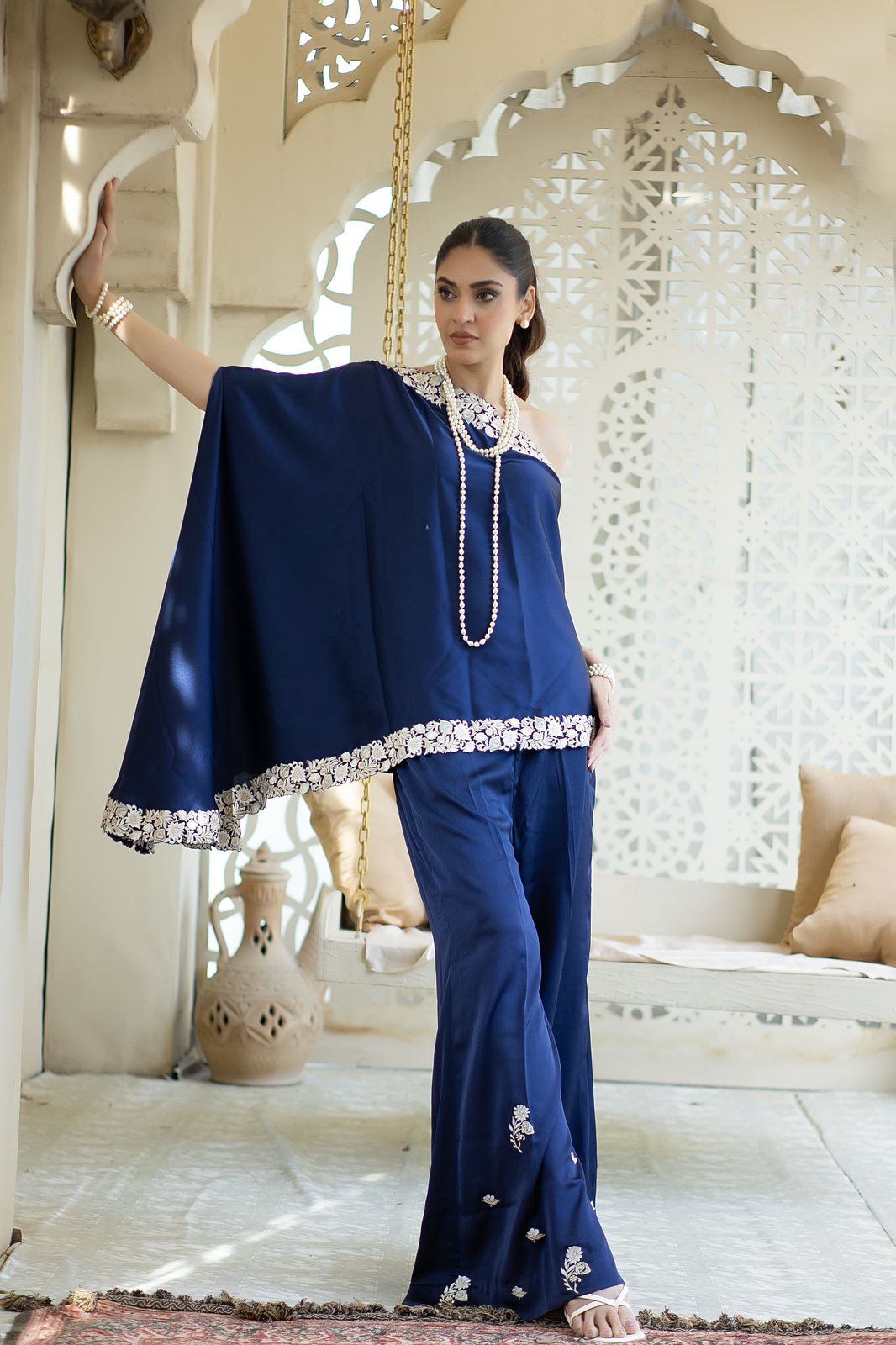 An asymmetrical dark blue hue sheesha silk attire made for your standout moment. This outfit has appliqué work on the blouse and botanical motifs on the bellbottoms.