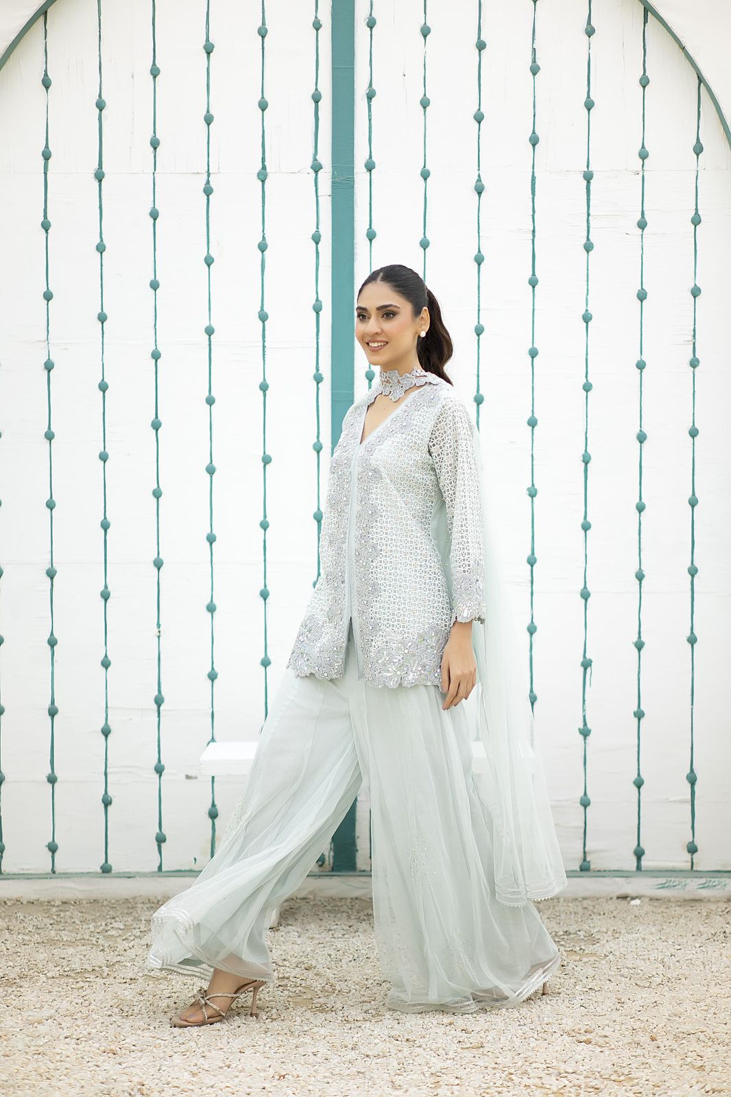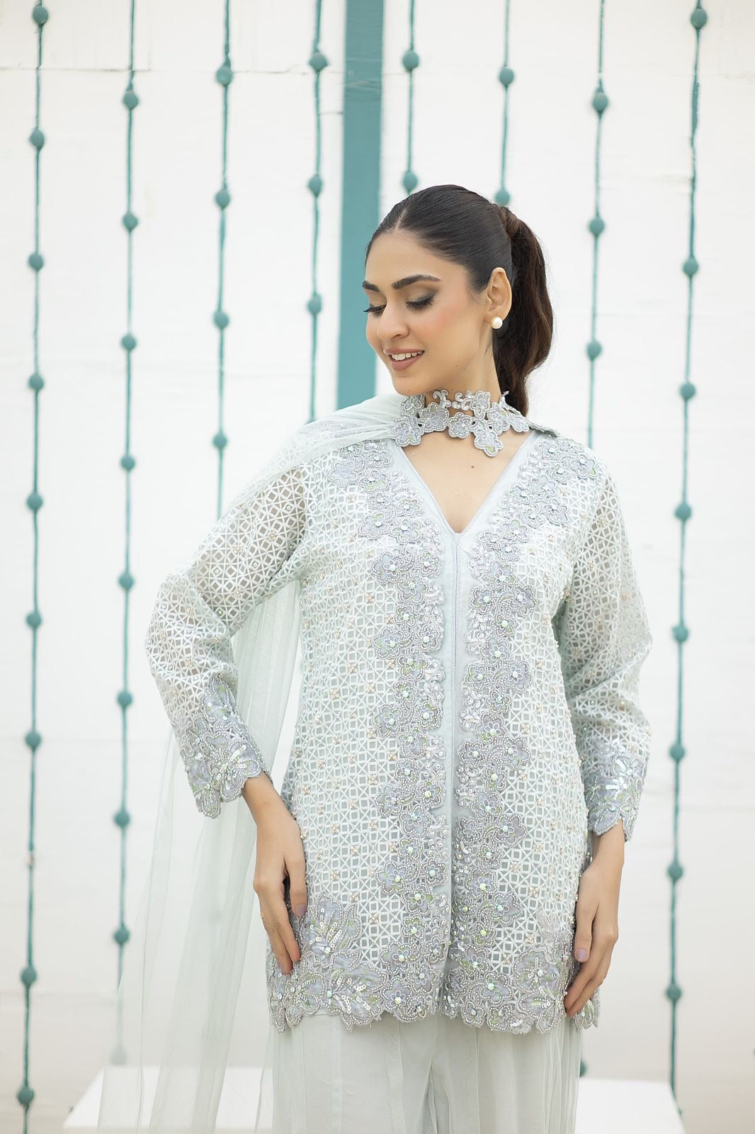 This outfit features a front open, rich in texture net jacket with lace appliqué details all over. Paired with net flare pants and a beautiful sash dupatta