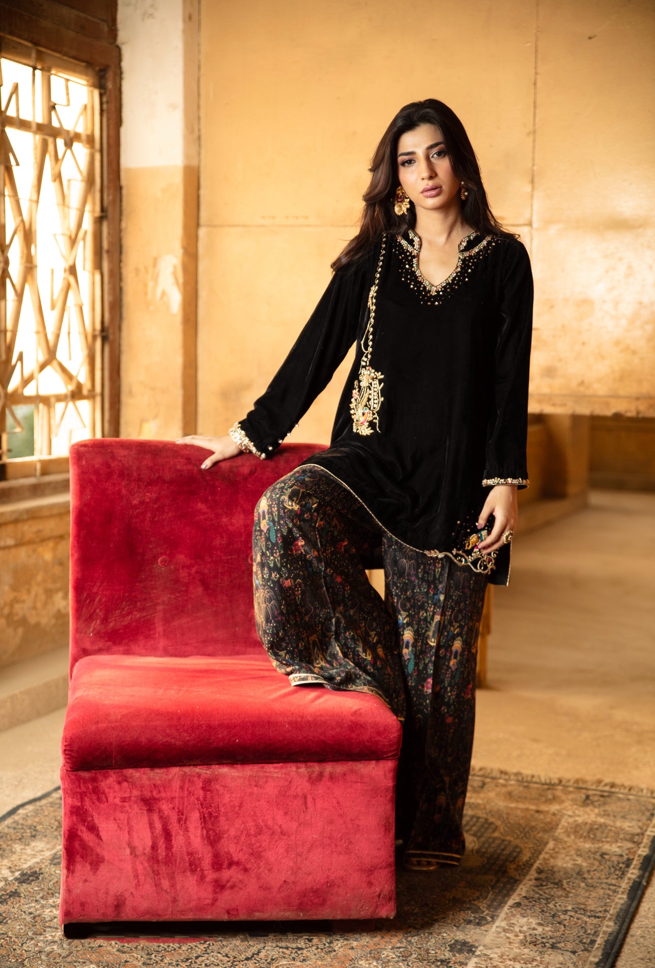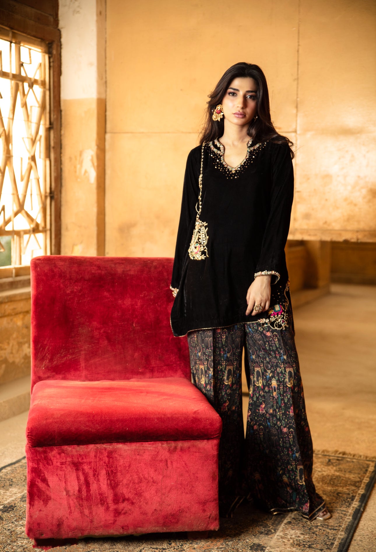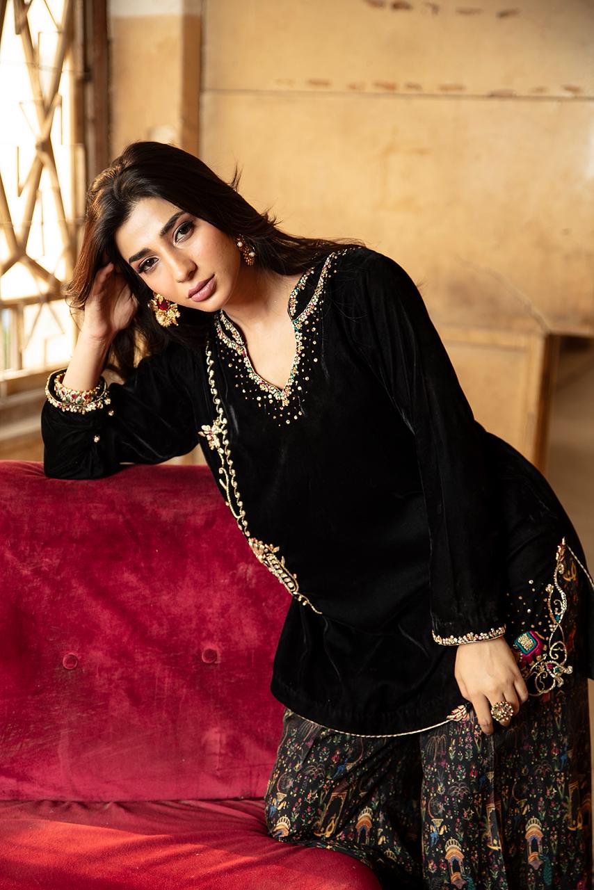 This black velvet ensemble features delicate zardoze handwork