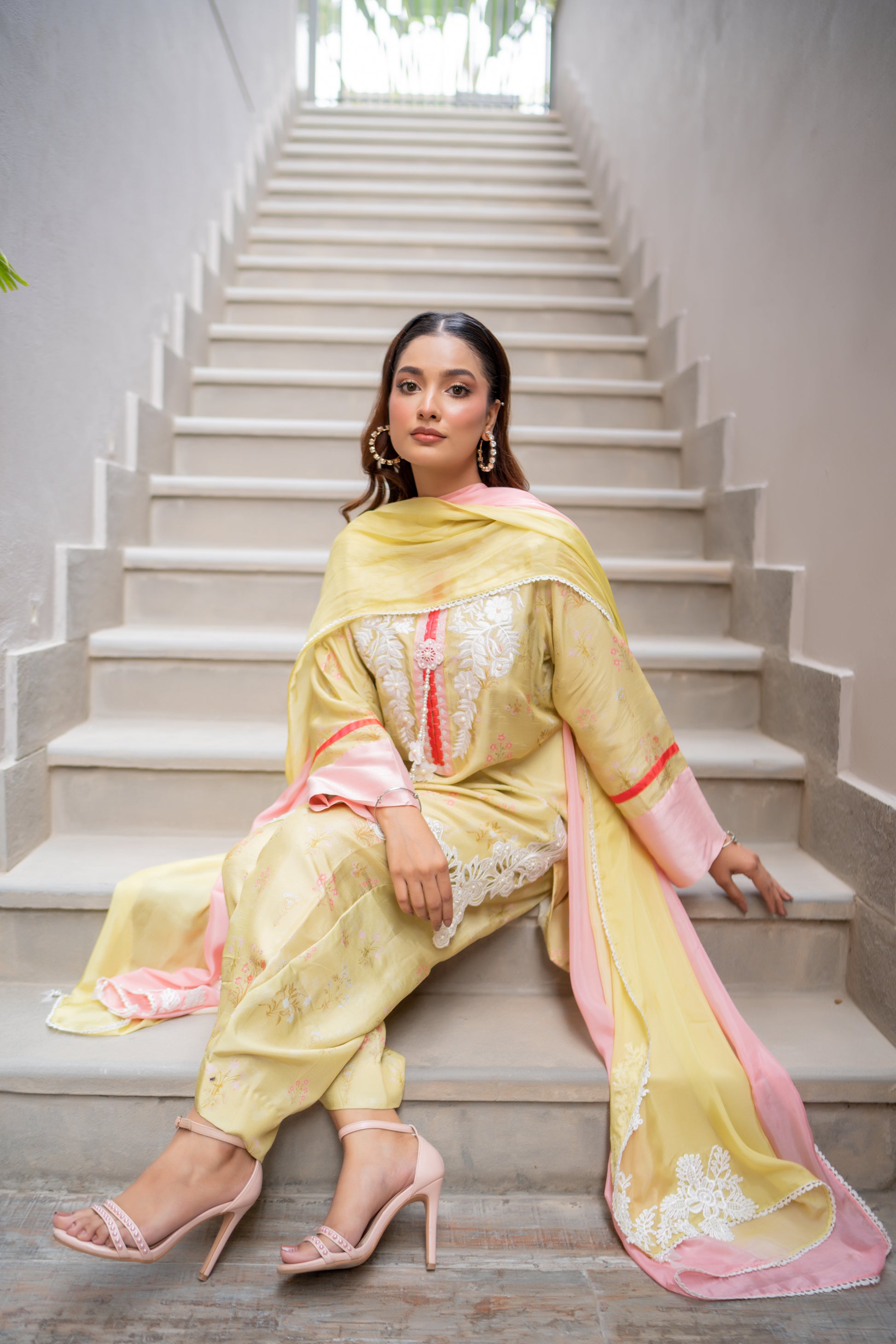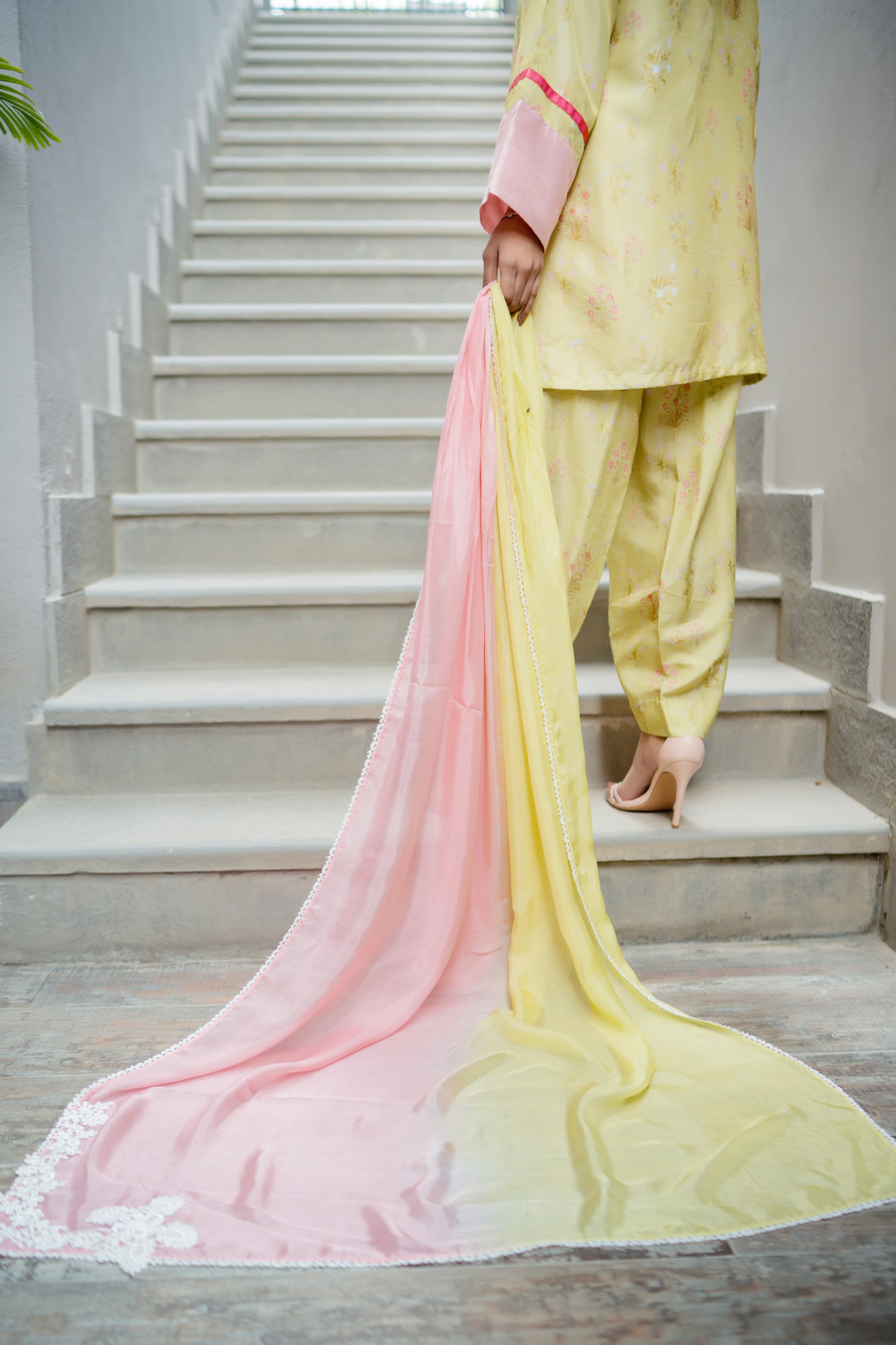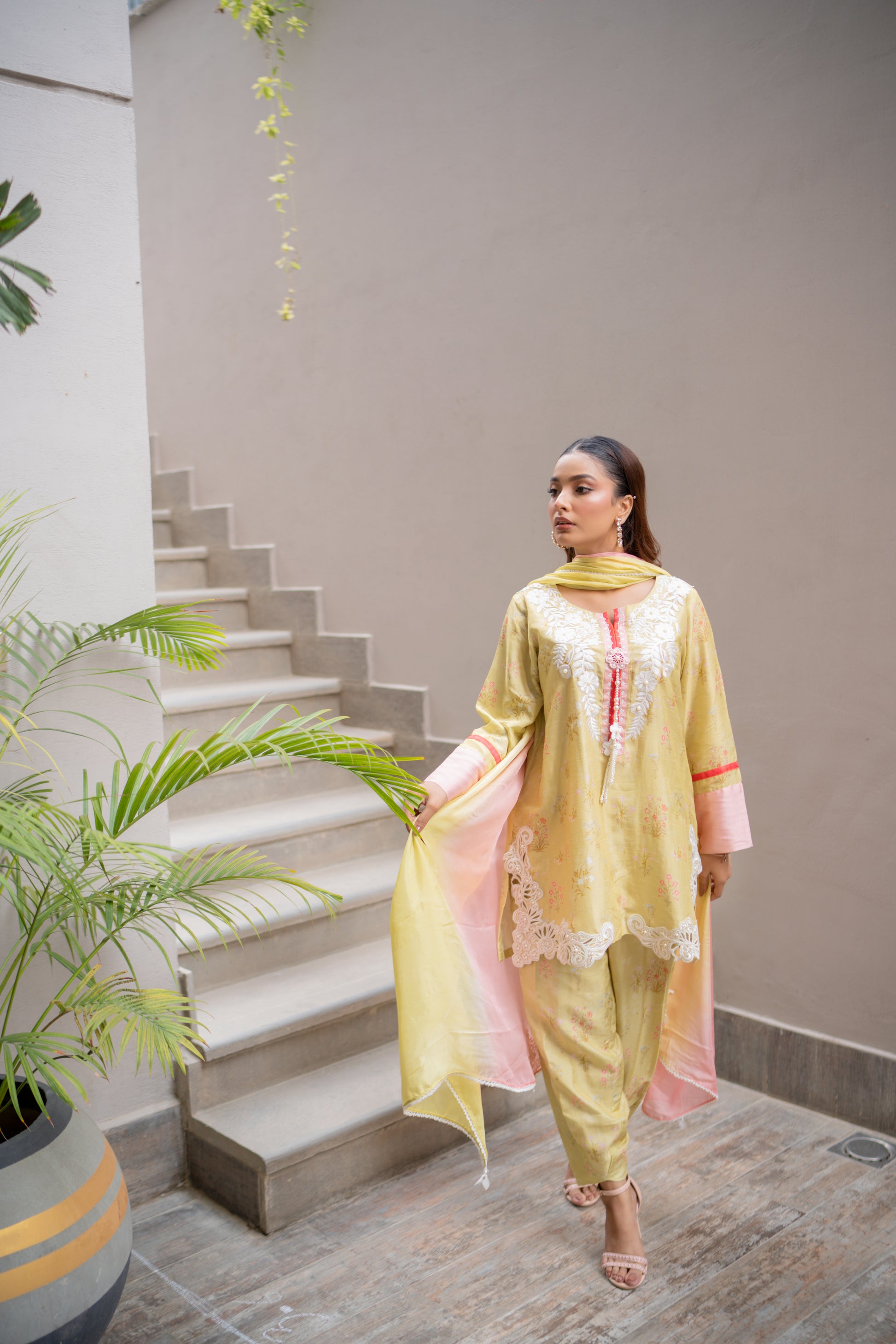 Step into a realm of vibrant artistry with a beautiful lemon yellow ensemble. A lawn short shirt showcases white bunch appliqués with handwork details. Complimented by a tulip shalwar and double shaded silk dupatta.