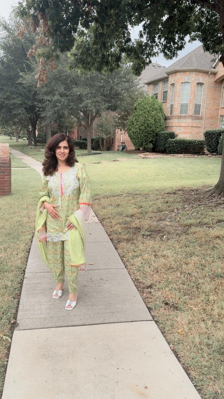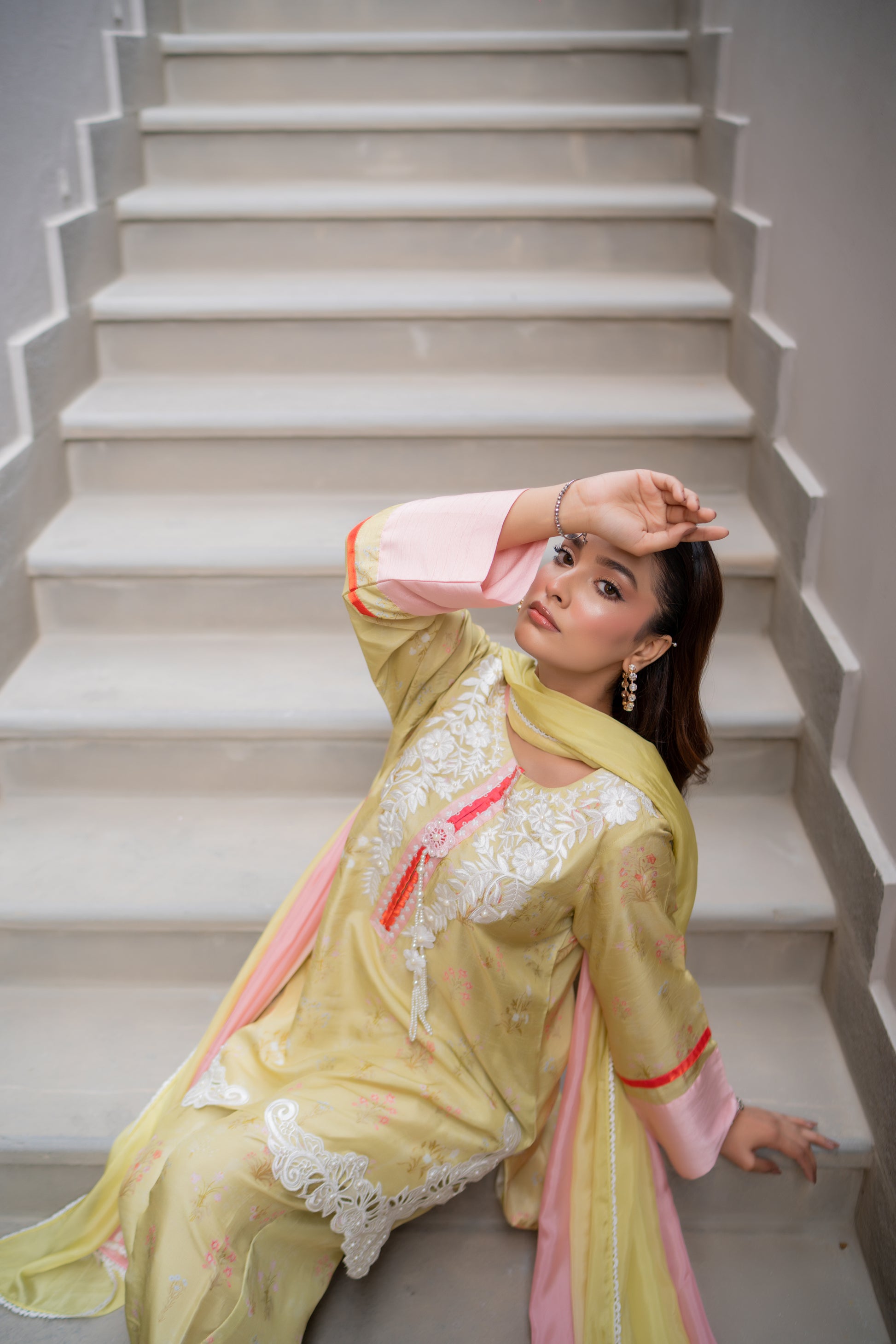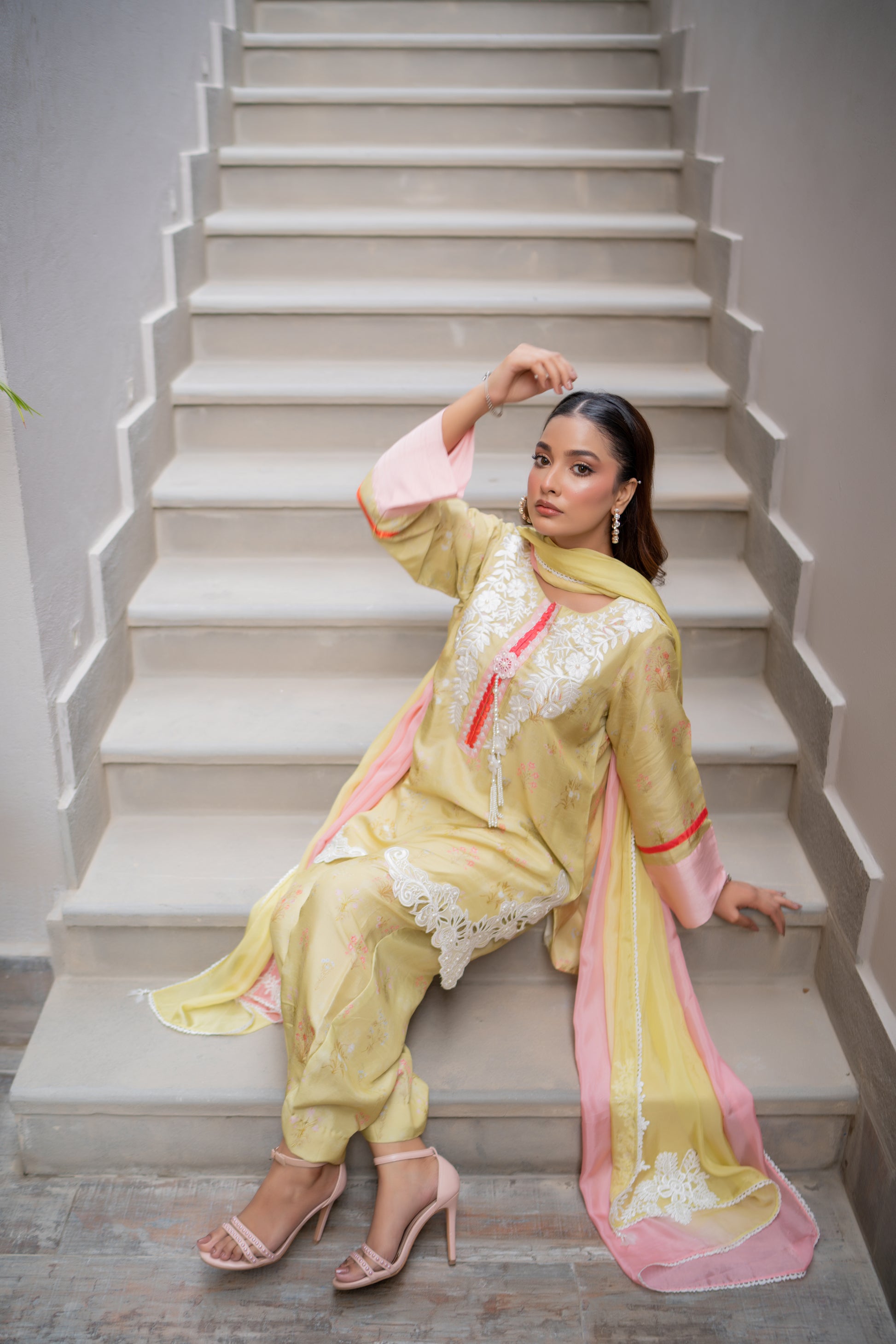 Step into a realm of vibrant artistry with a beautiful lemon yellow ensemble. A lawn short shirt showcases white bunch appliqués with handwork details. Complimented by a tulip shalwar and double shaded silk dupatta.