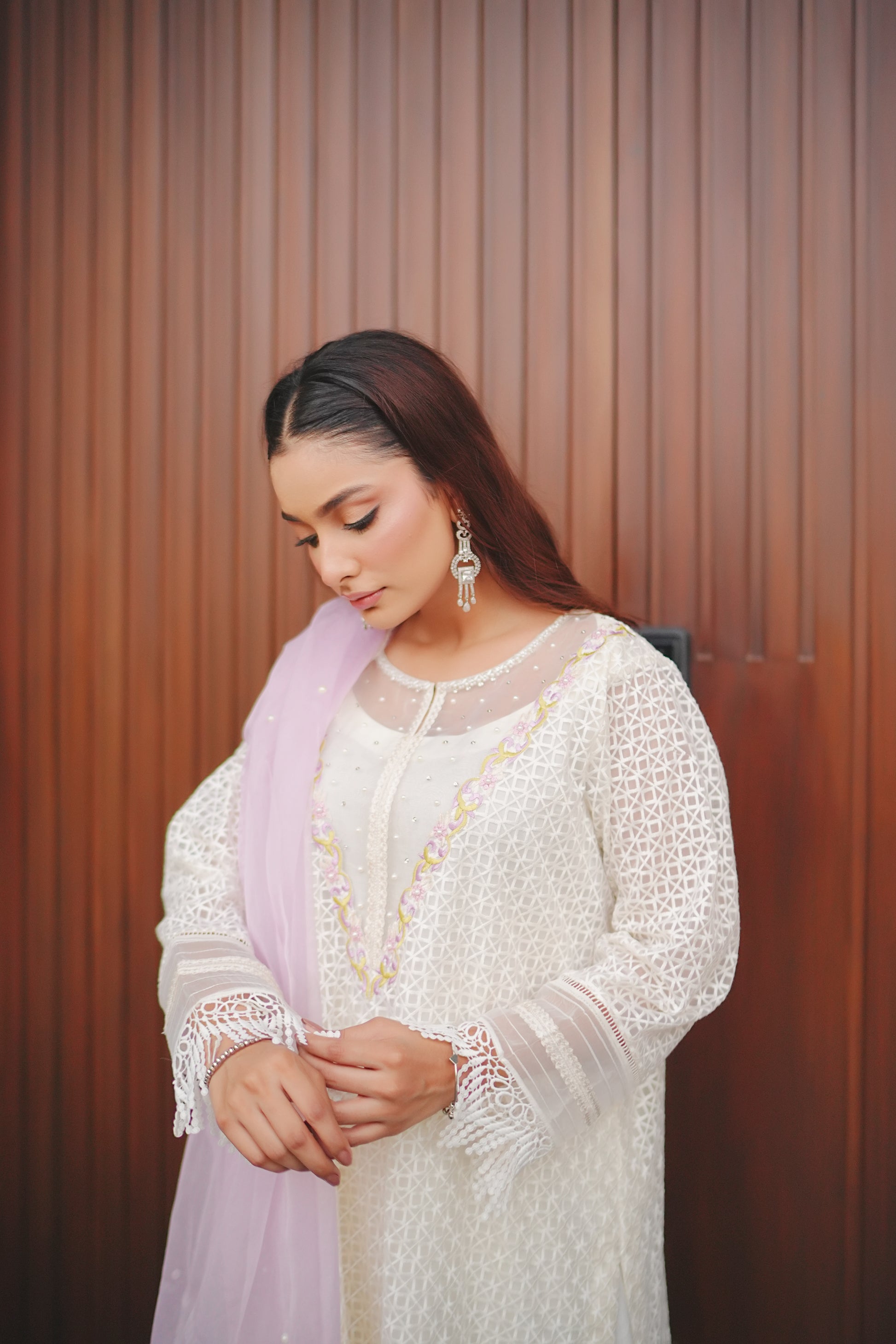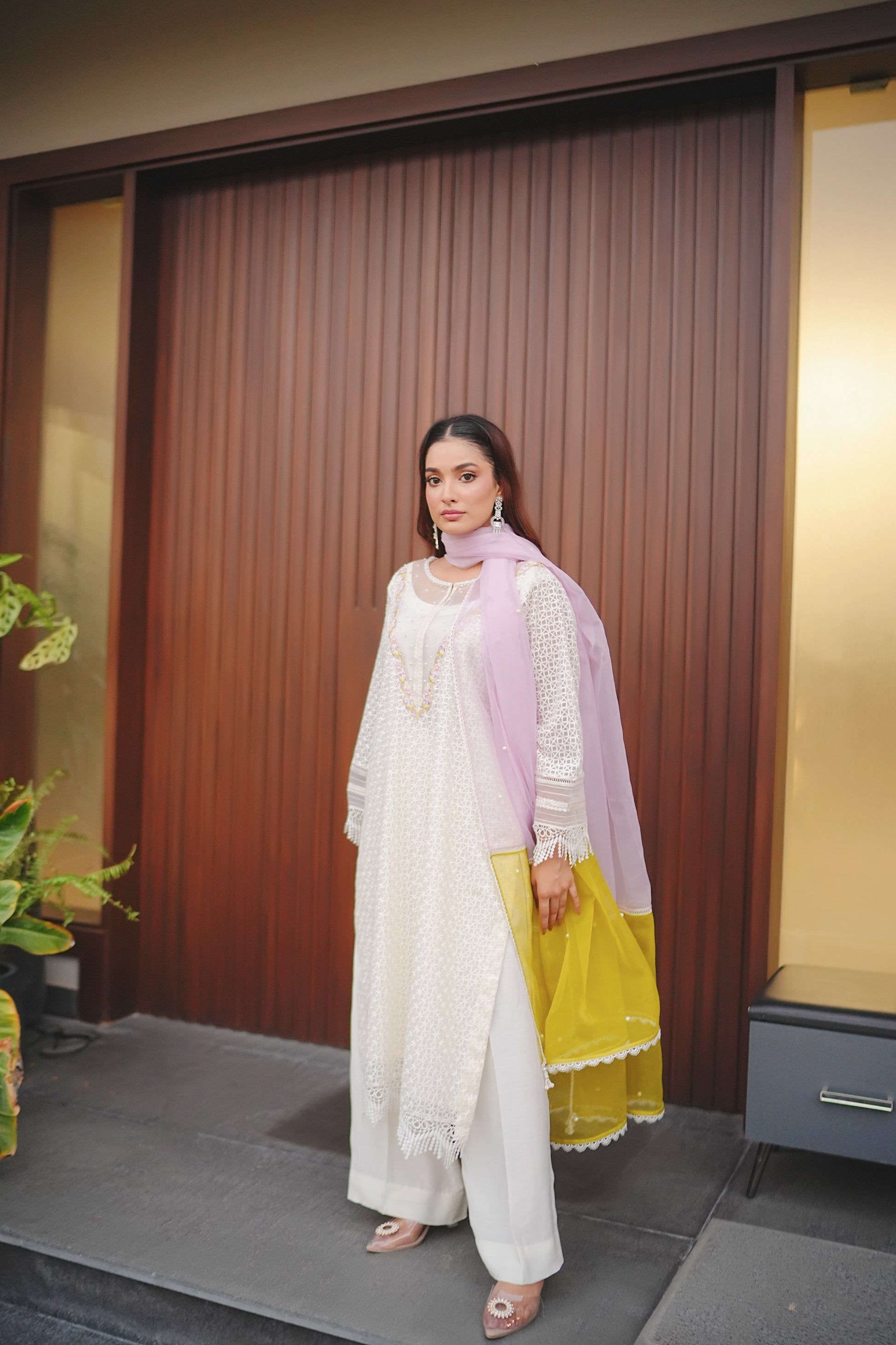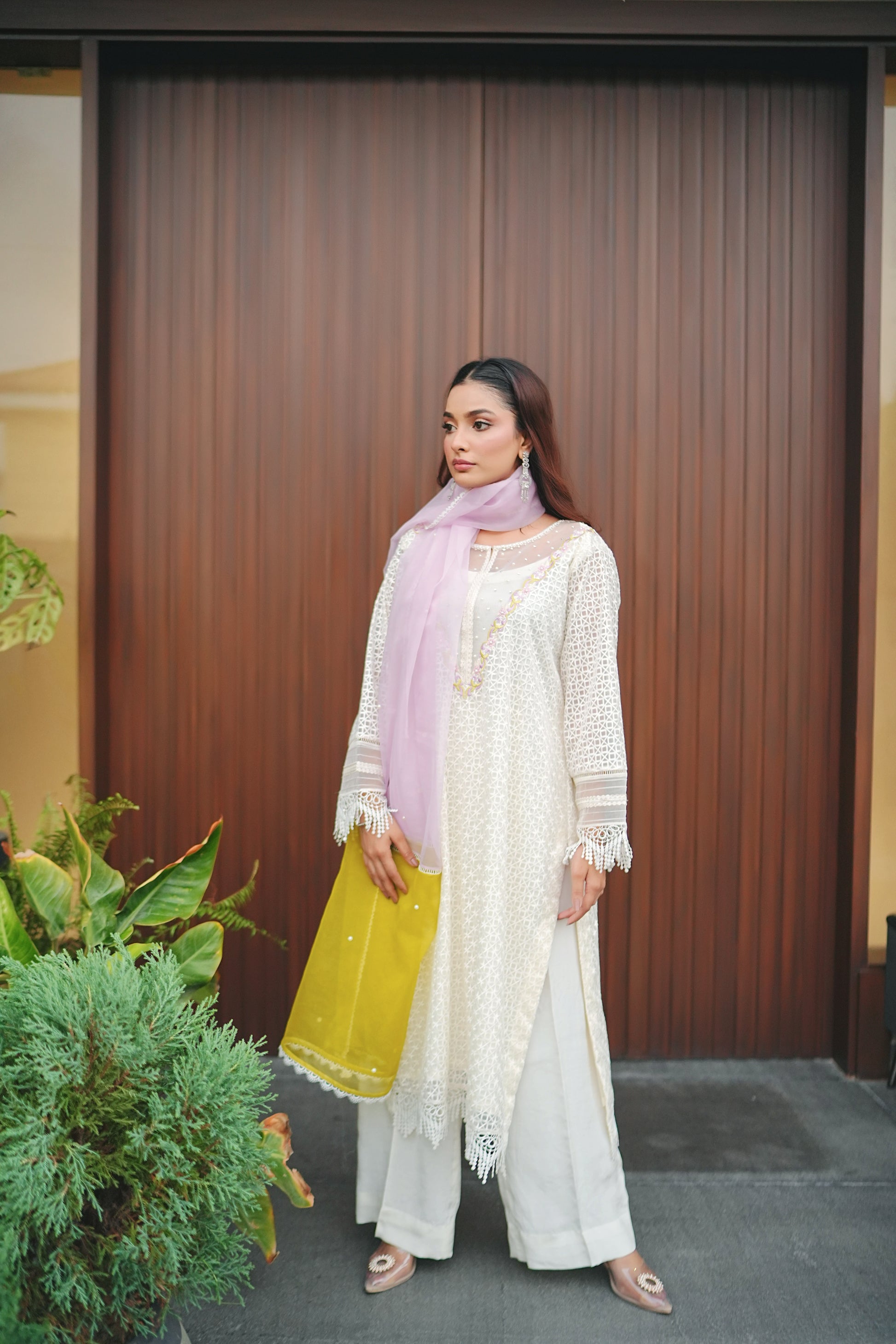 A vision of grace, this relaxed silhouette is rendered in a moonlit ivory hue, adorned with intricate botanical embroidery in pastel threadwork with pearls. Crafted from khaddi net, the delicately embellished ensemble exudes timeless charm. Comes with a double shaded organza dupatta and flare pants.