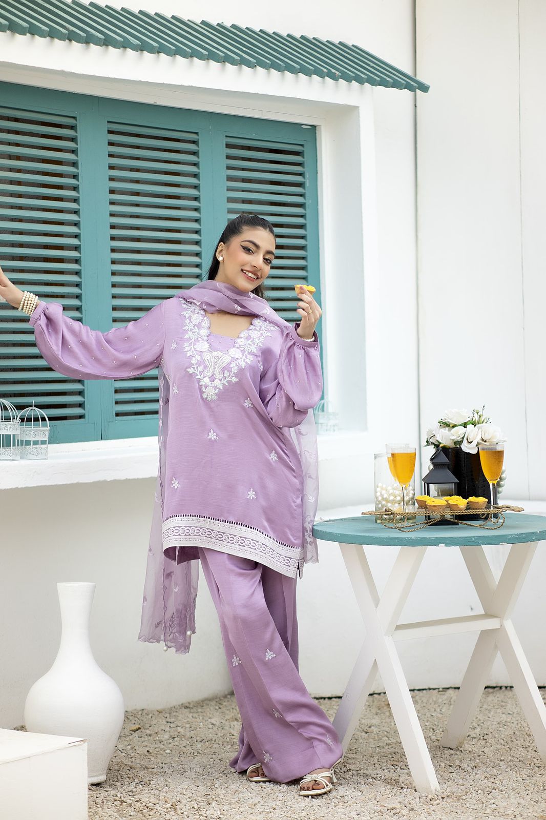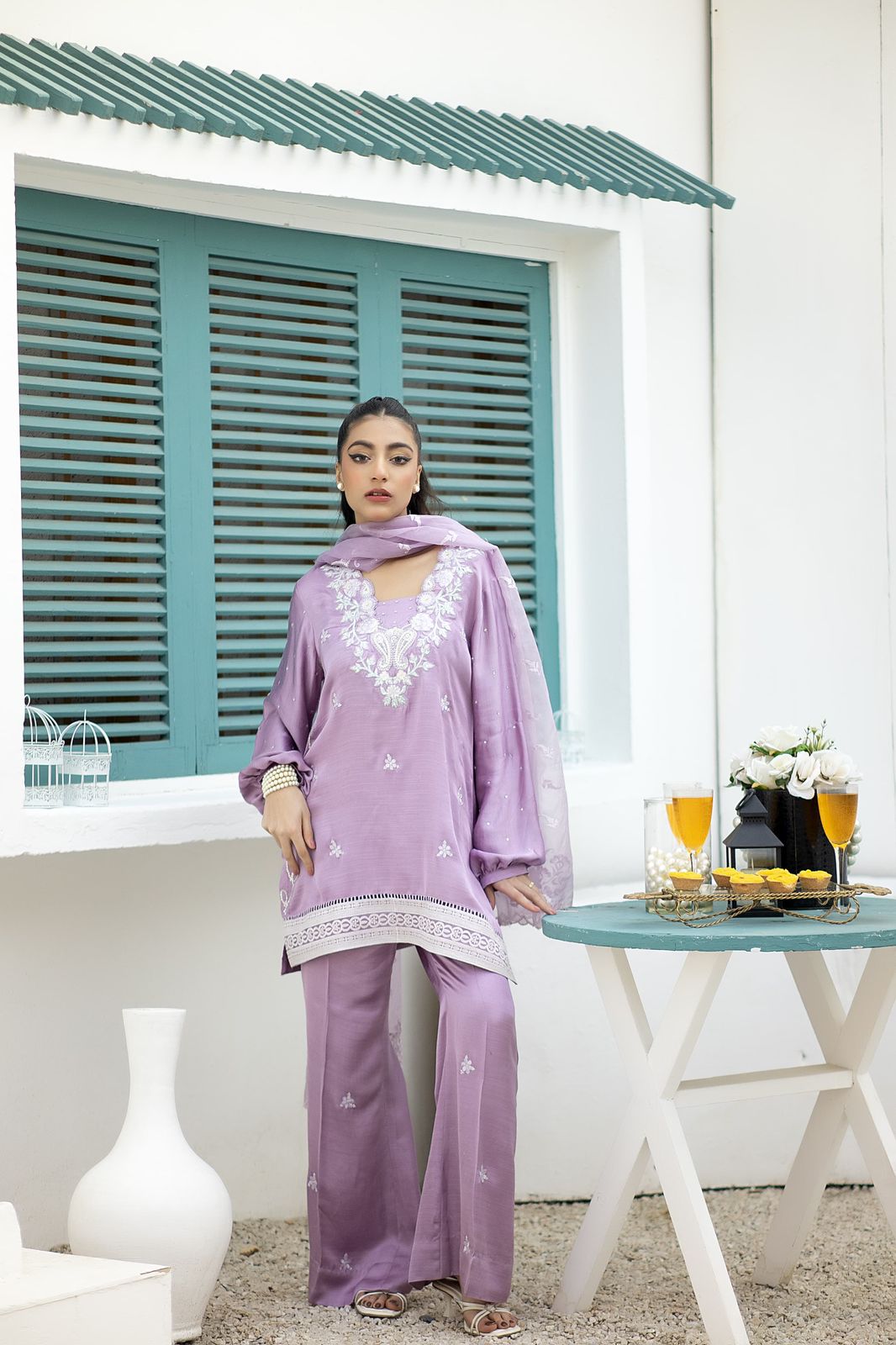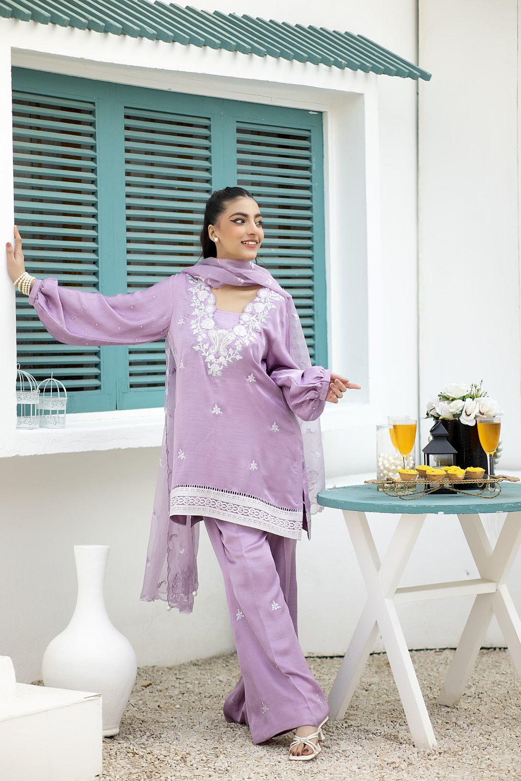A whimsical wonder, raw silk short shirt in lilac hue is embroidered with delicate botanical butis, applique work and intricate details. Paired with bell bottoms in a matching shade. An organza dupatta featuring an exquisite stone and lace work completes the look.
