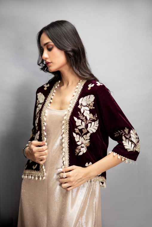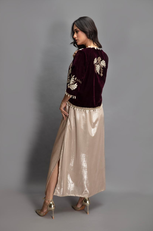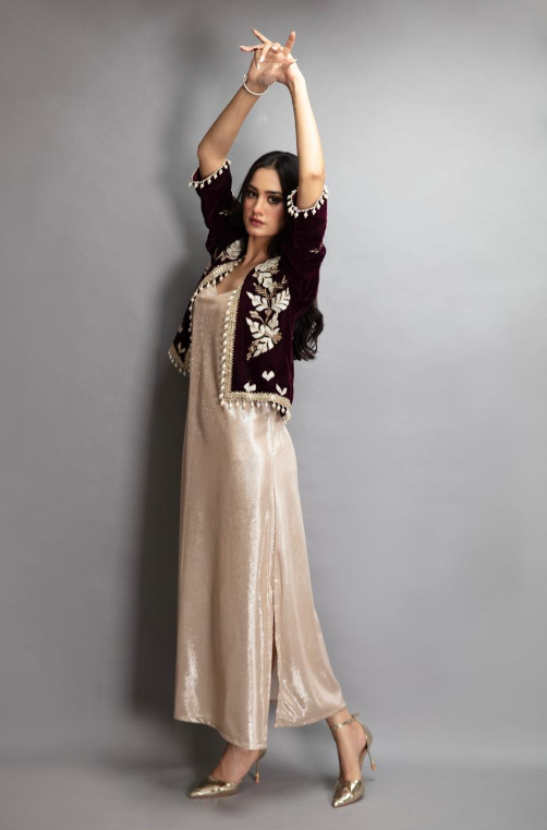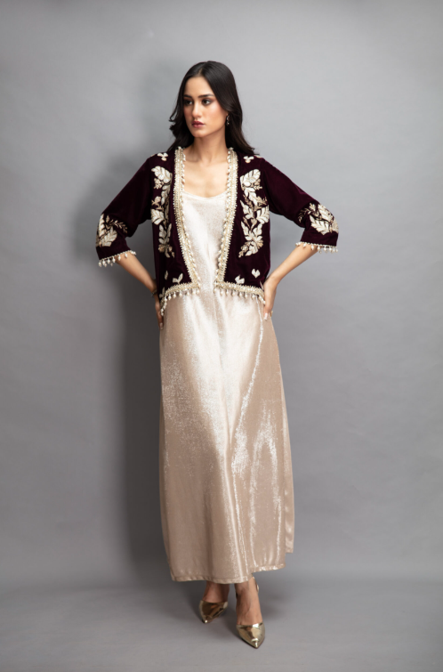 Redefining effortless style, this outfit is made of a short velvet jacket with a long charmuse dress with pearl and kamdani details in order to help you stand out.