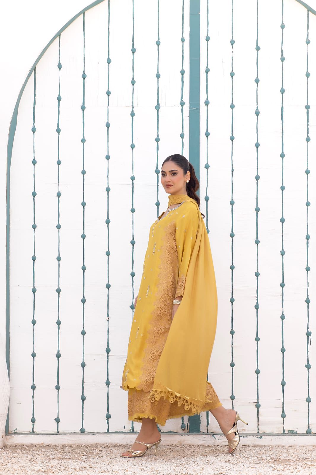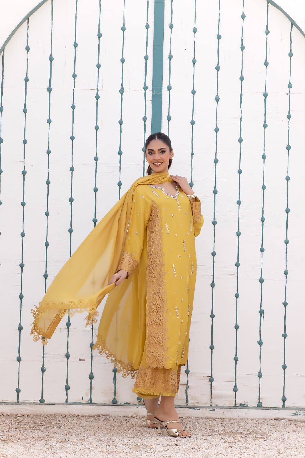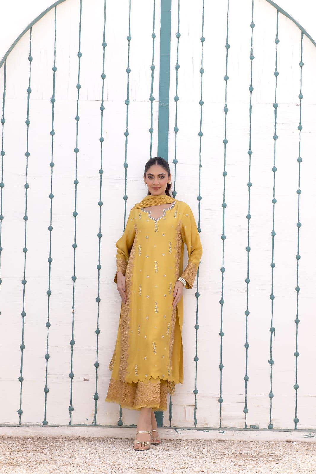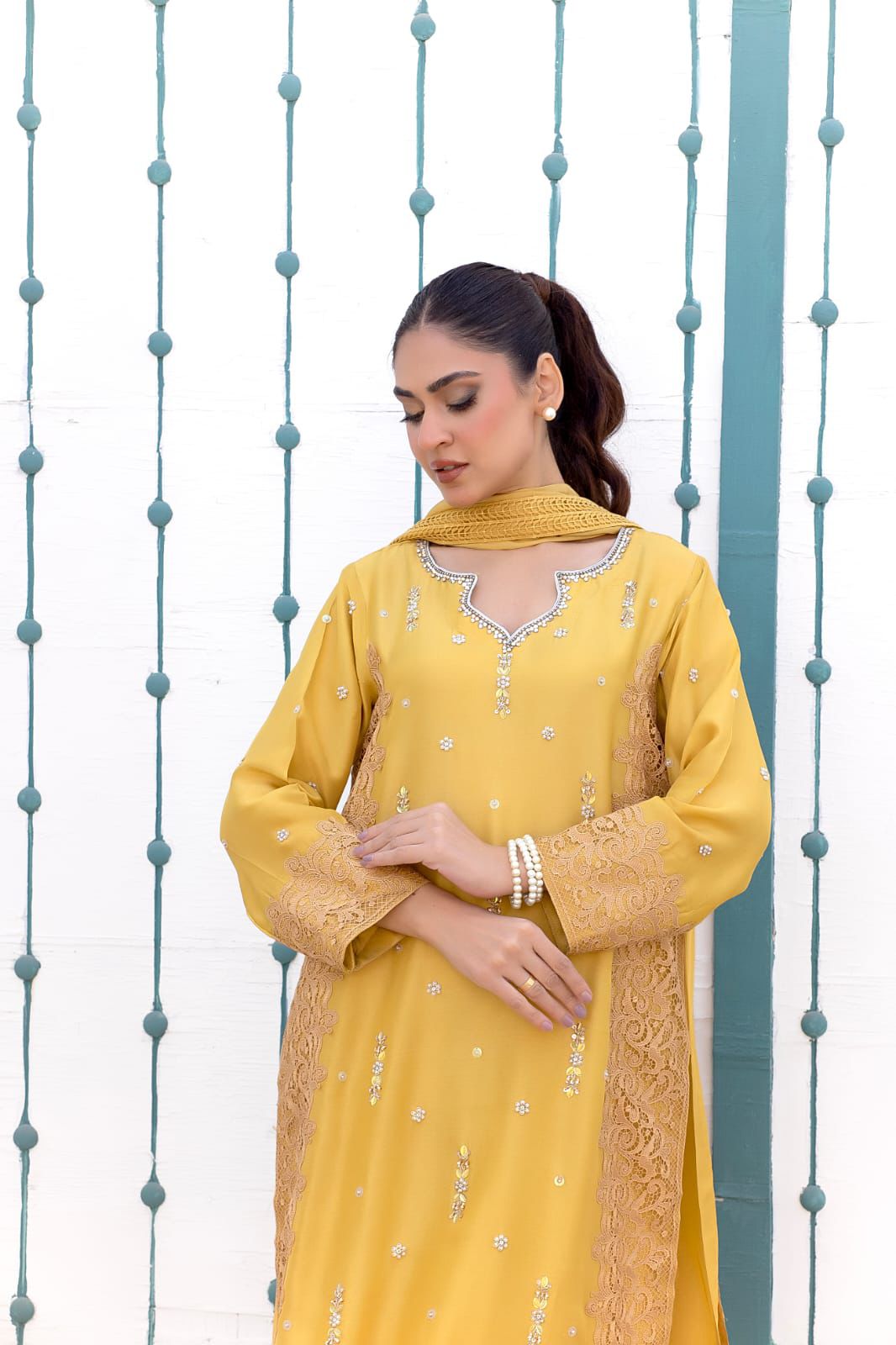 Mustard yellow long shirt and culottes cut from sheesha silk are adorned with stone work, lace and beautifully made butis. Sleeves, chalk and pants have lace details. The look is complemented with cutwork details. Paired with silk dupatta.