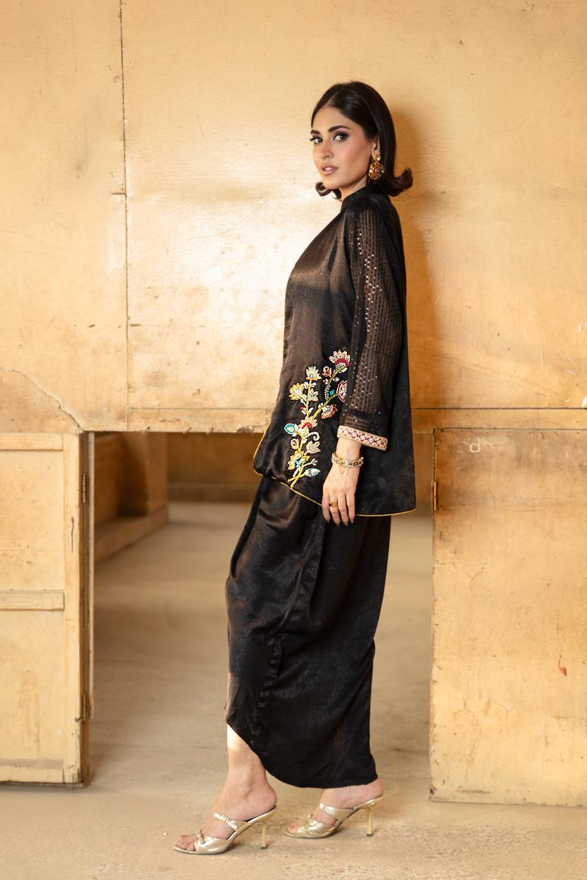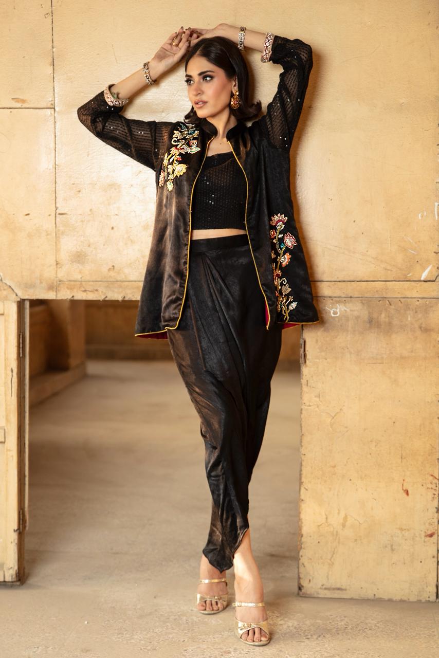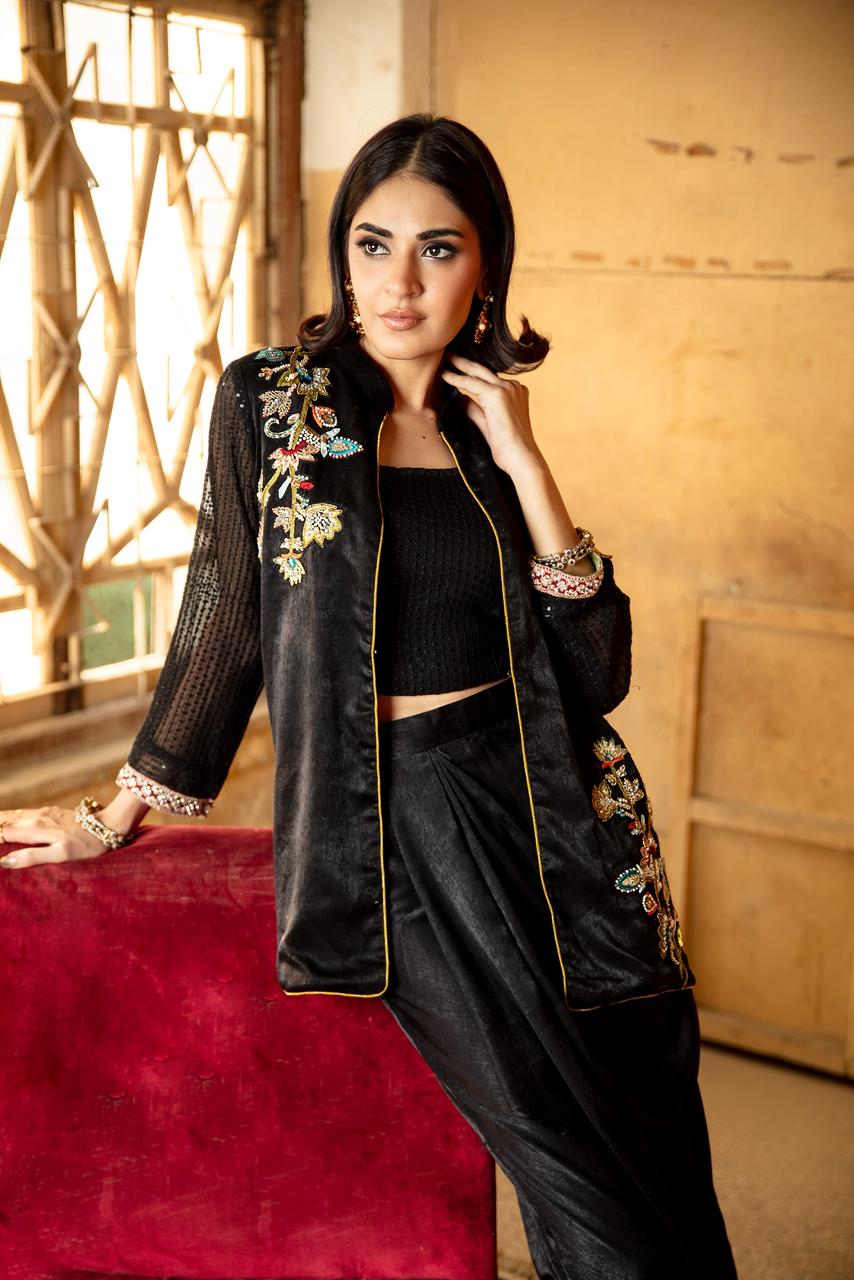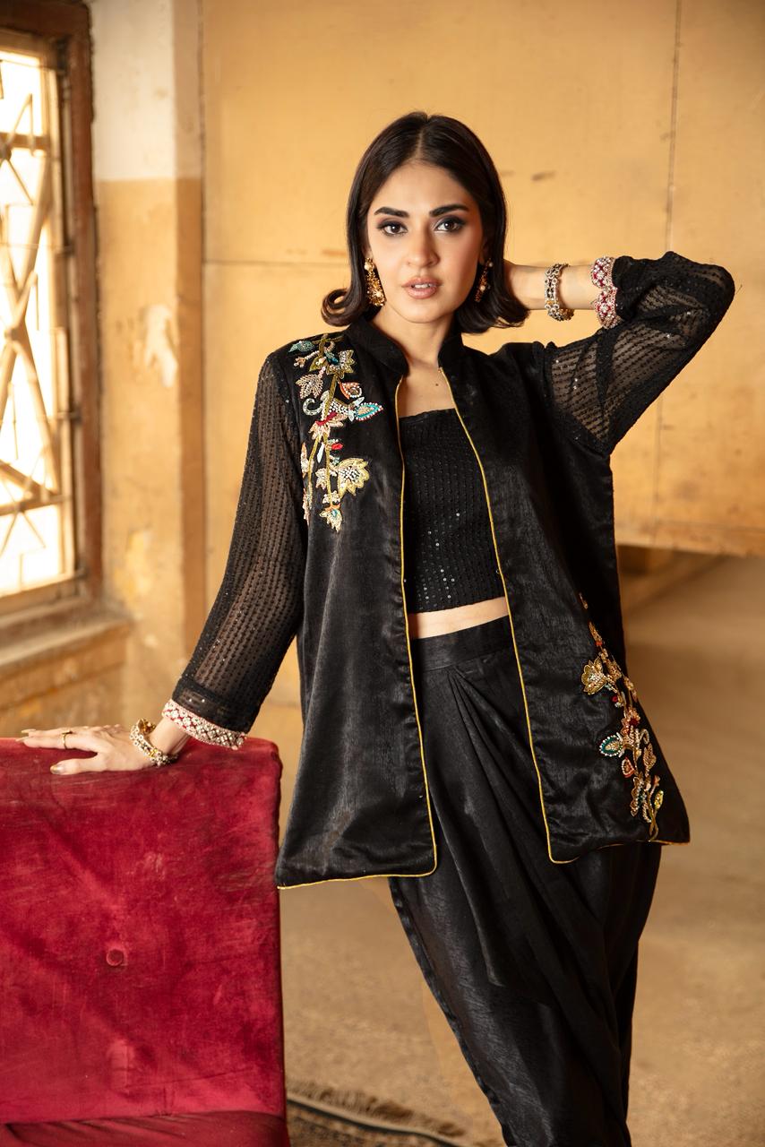 This beautiful black jacket is paired with a black sequinned tube top, giving the look a modern, festive edge. The sleeves are crafted from a subtly shimmering sheer fabric, adding texture and sophistication.