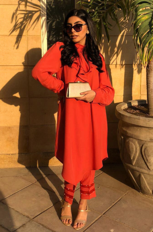Coral Ruffle neck shirt with stylish sleeves and slightly detailed pants Is a perfect fit for tea parties!