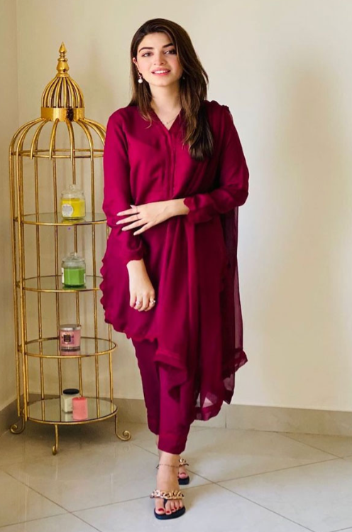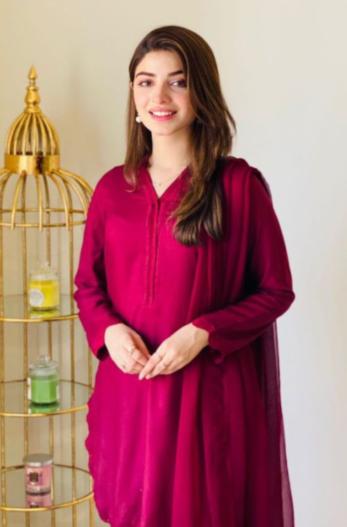 Maroon 2 piece set with a v-neckline and simple cutting on the end of the shirt.
