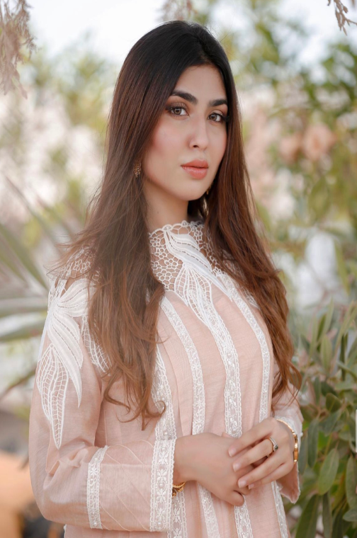 This peachy pink outfit is curated with white laces and has a unique neckline cut to add to the outfit making it look trendy and elegant.