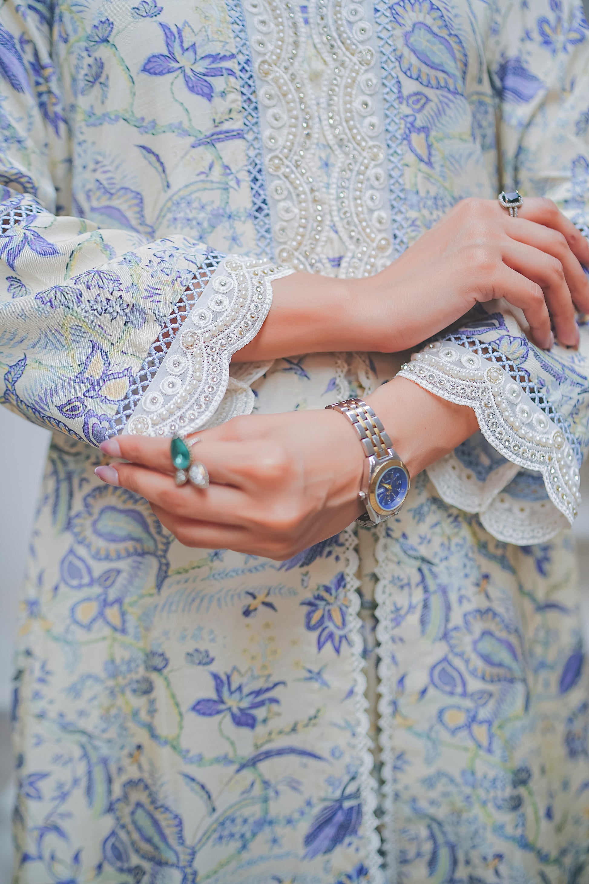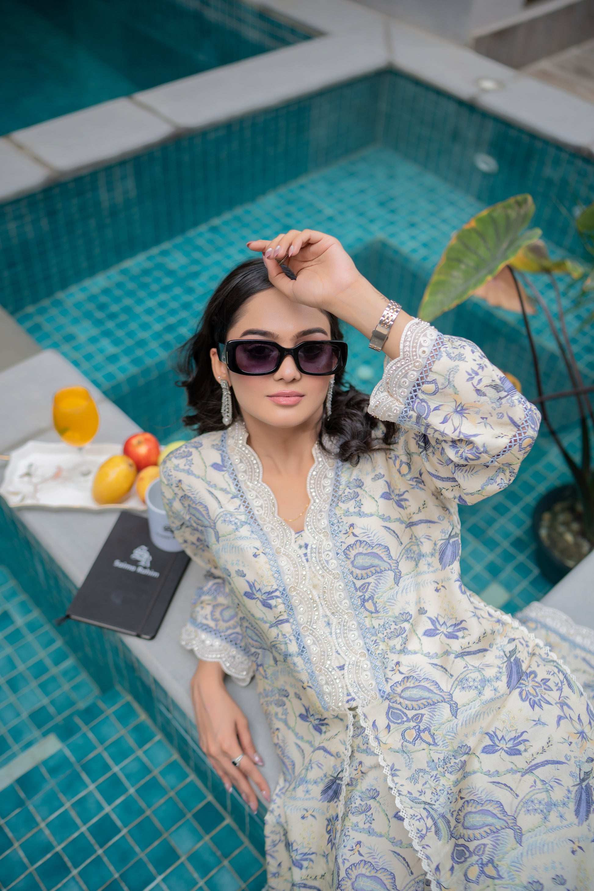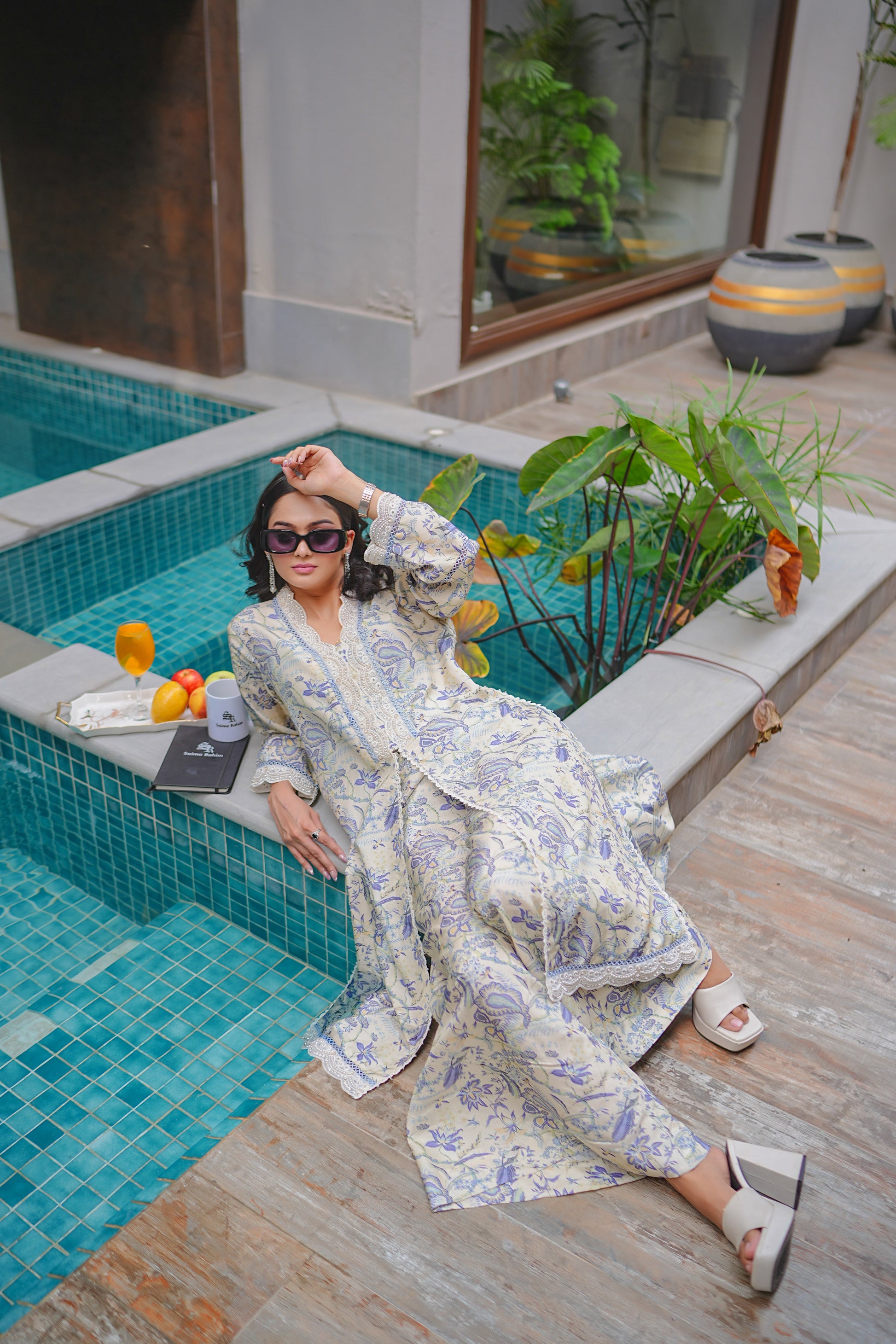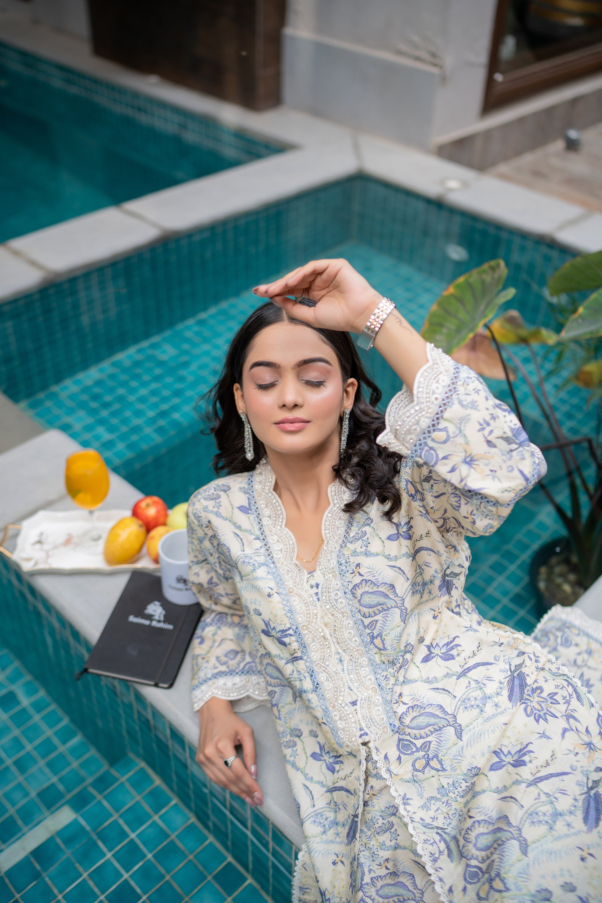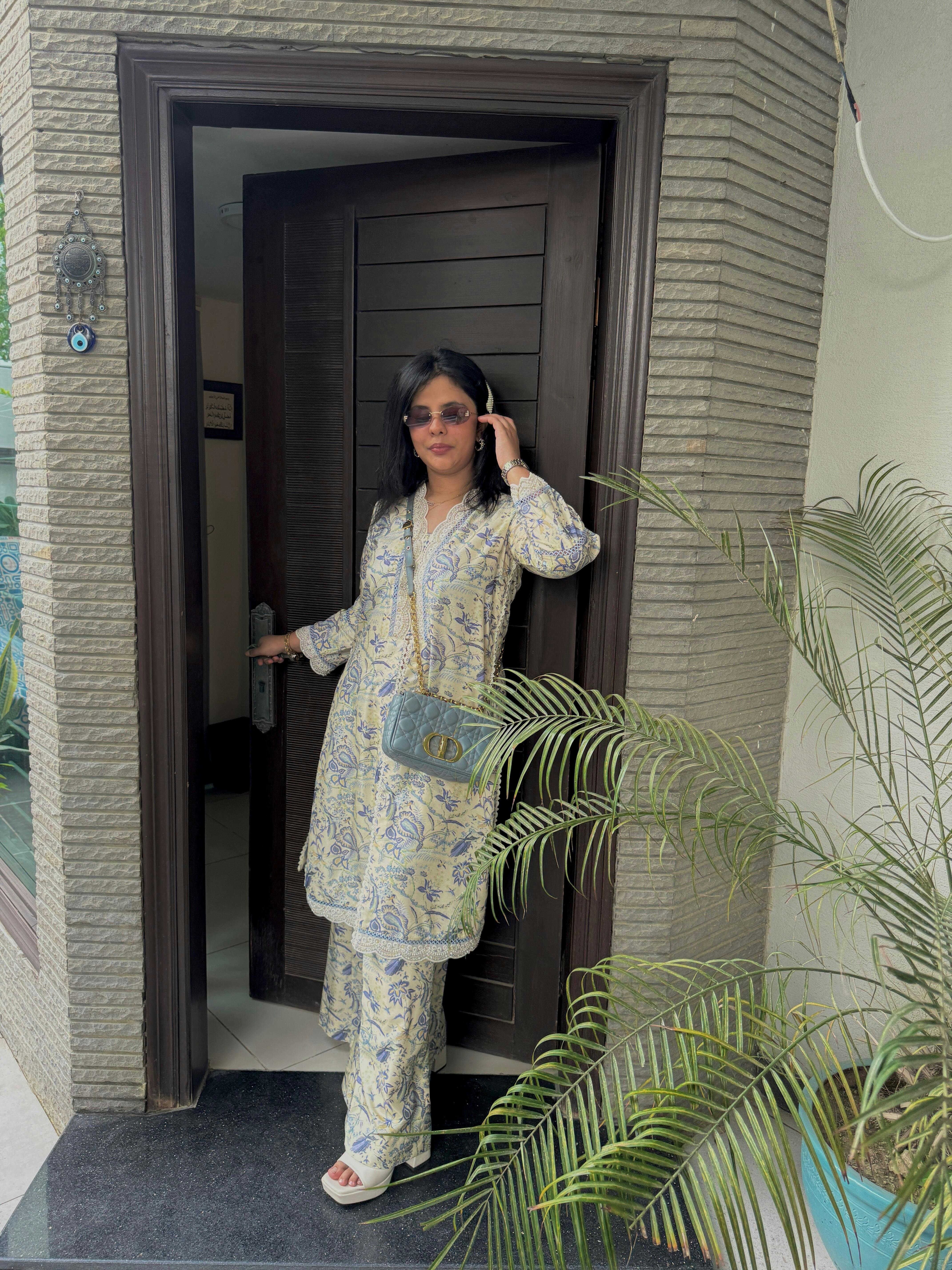 A beautiful crafted digital print ensemble, comes with flared pants and a front open mid length shirt with lace details that do all the talking!