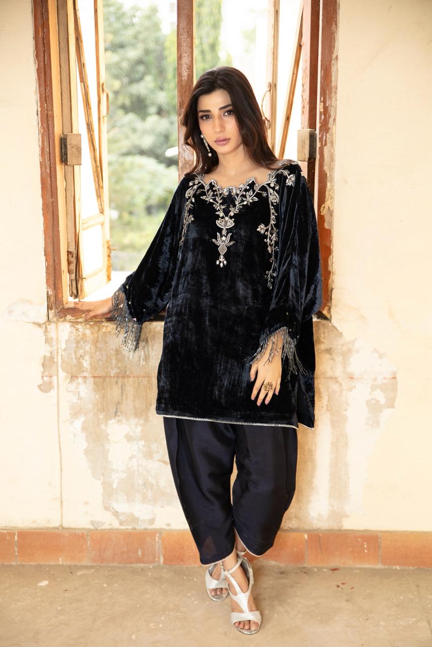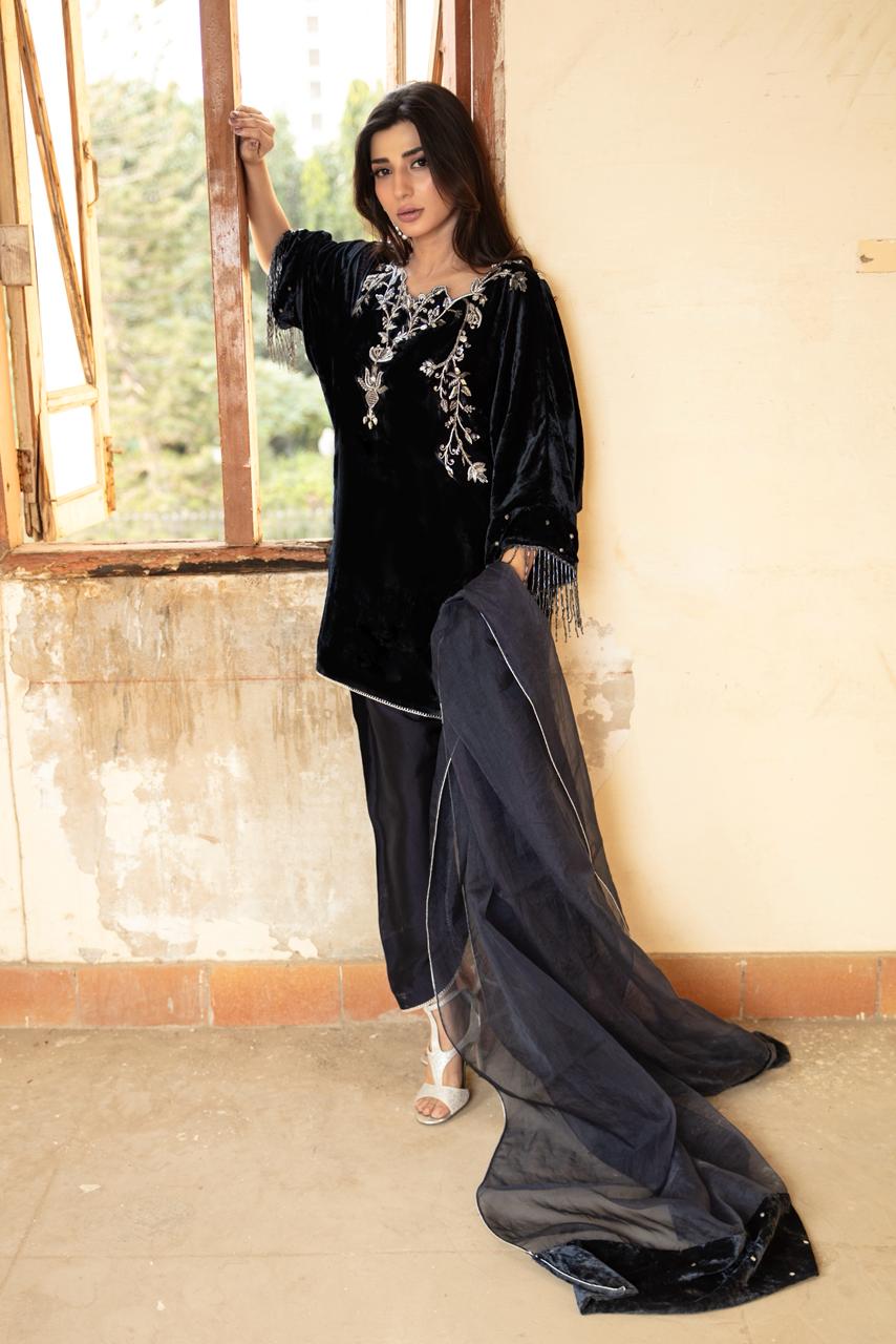 This outfit features a short shirt crafted with silver zardoze handwork that transitions beautifully in the velvet. The shirt is adorned with bunch detailing on the sleeves and back, adding a touch of femininity and flow. Paired with tulip shalwar an organza dupatta.
