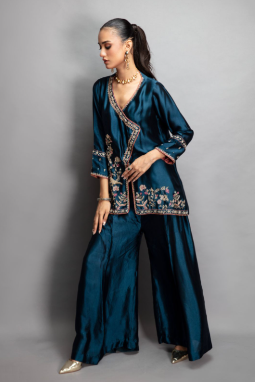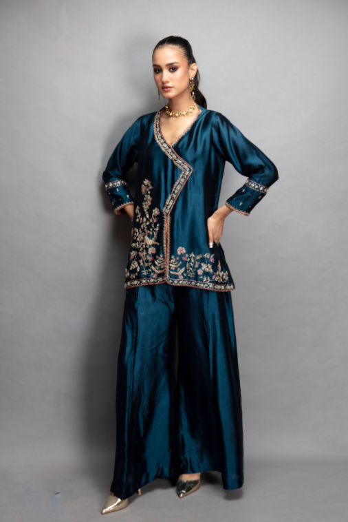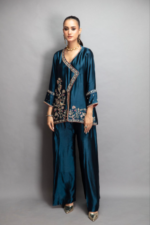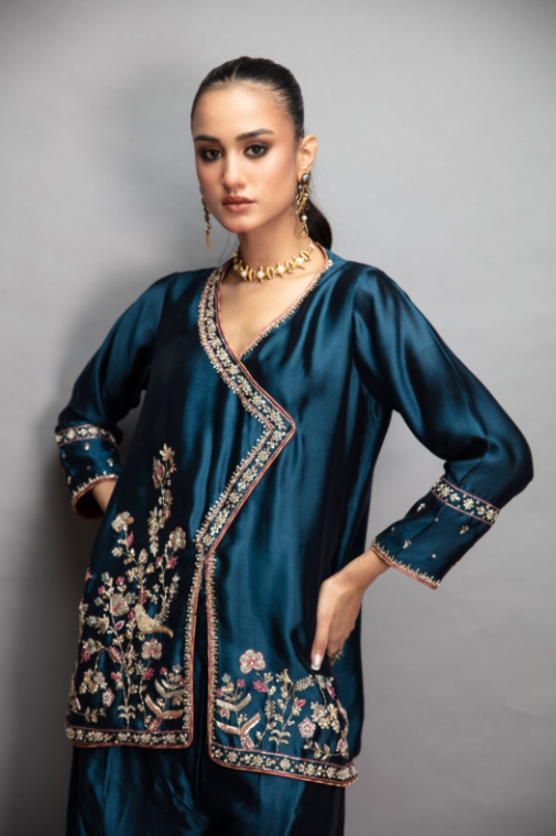 A pure sheesha silk shirt with detailed hand work and a touch of pink resham. Worn with flare pants.