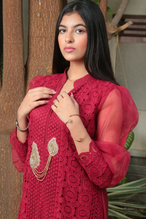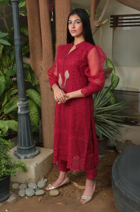 Classic Crimson Red edgy shirt and pants with puffy organza sleeves!