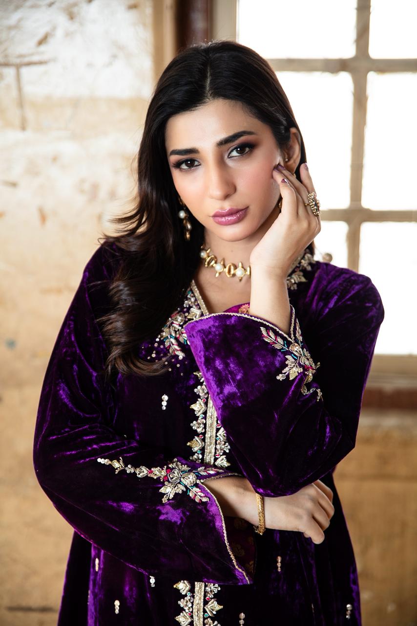 Step into a realm of vibrant artistry with a beautiful purple ensemble.