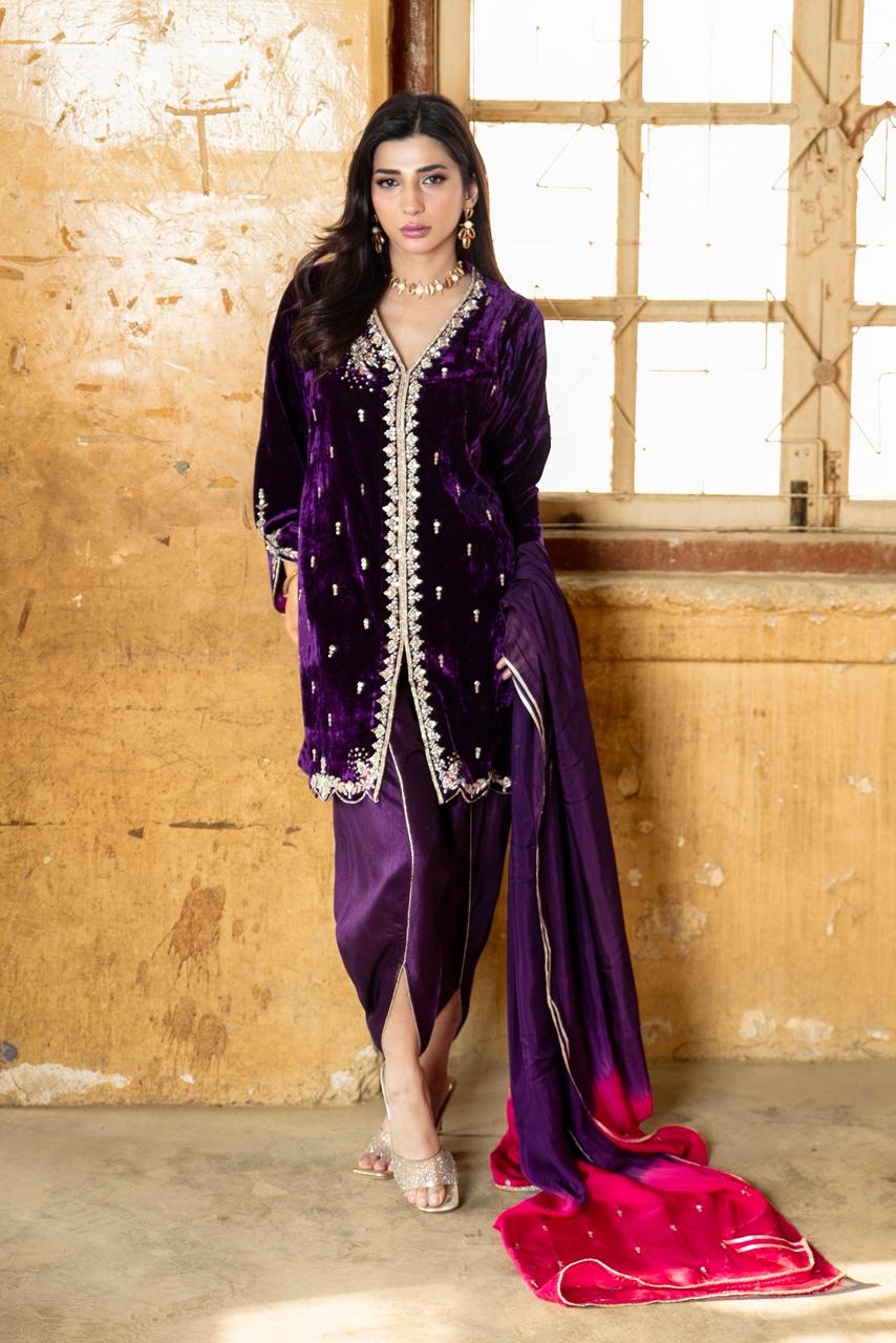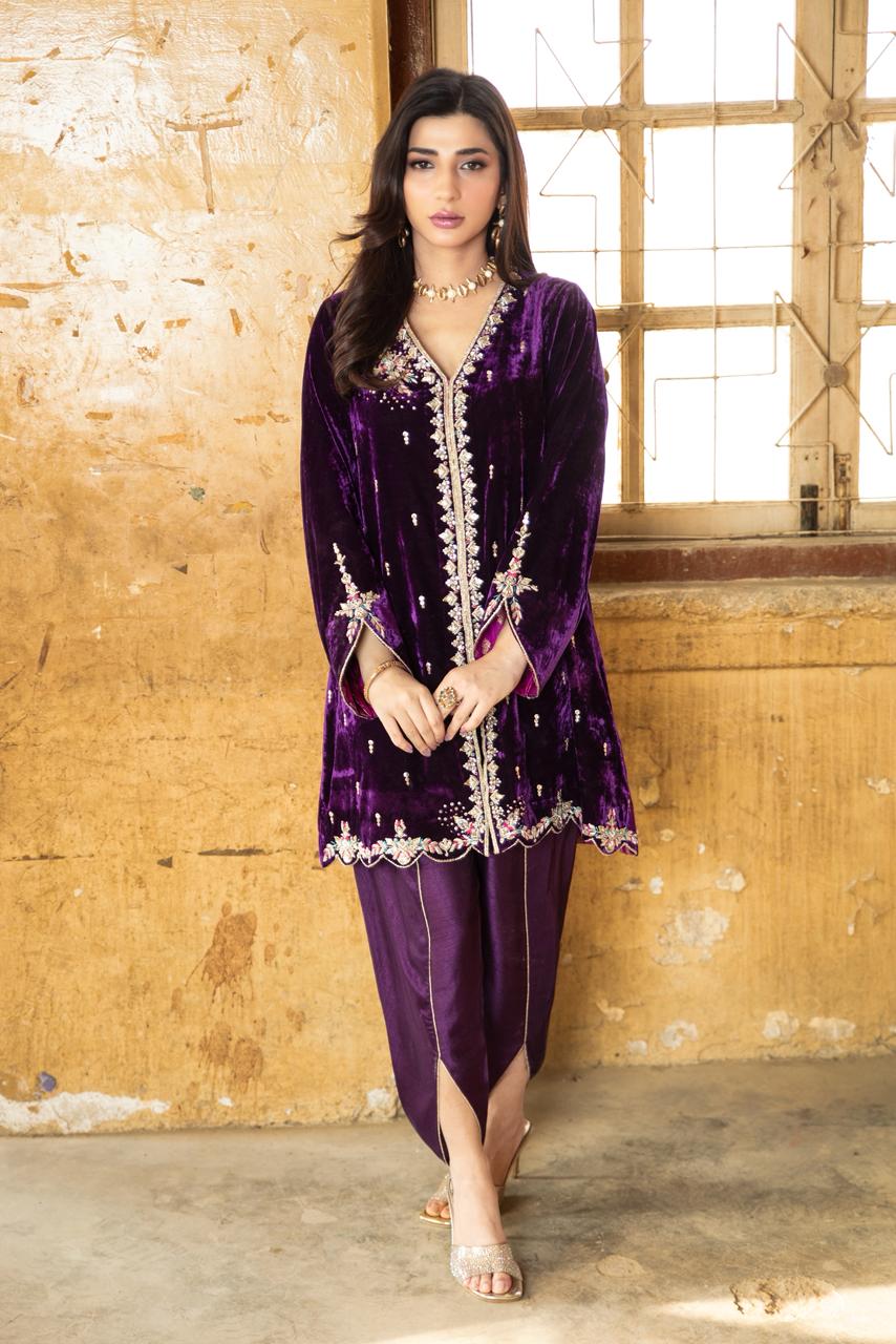 A velvet short shirt showcases dull gold zardozi and resham handwork details.