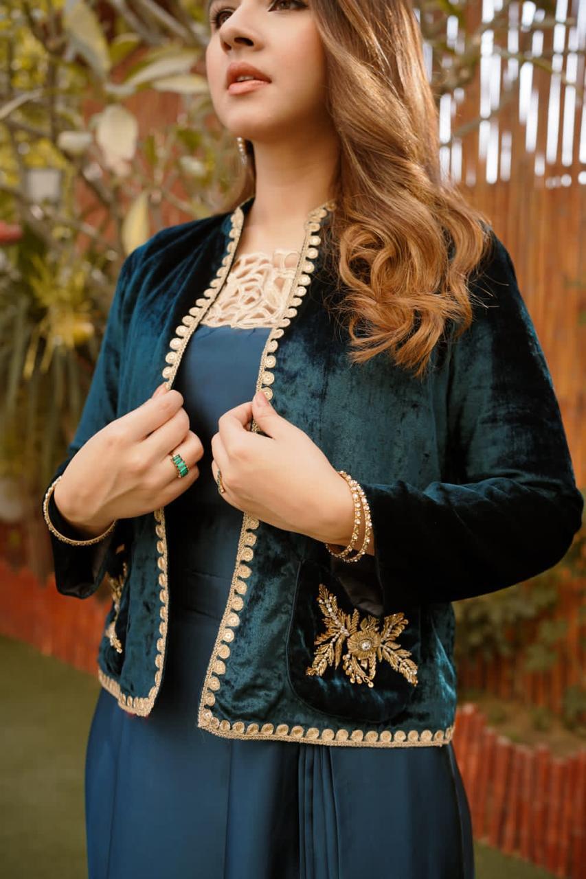 Vanya — graceful and strong — this jacket set redefines contemporary regal with structured velvet, gold embroidered florals, and effortless silhouette flow.